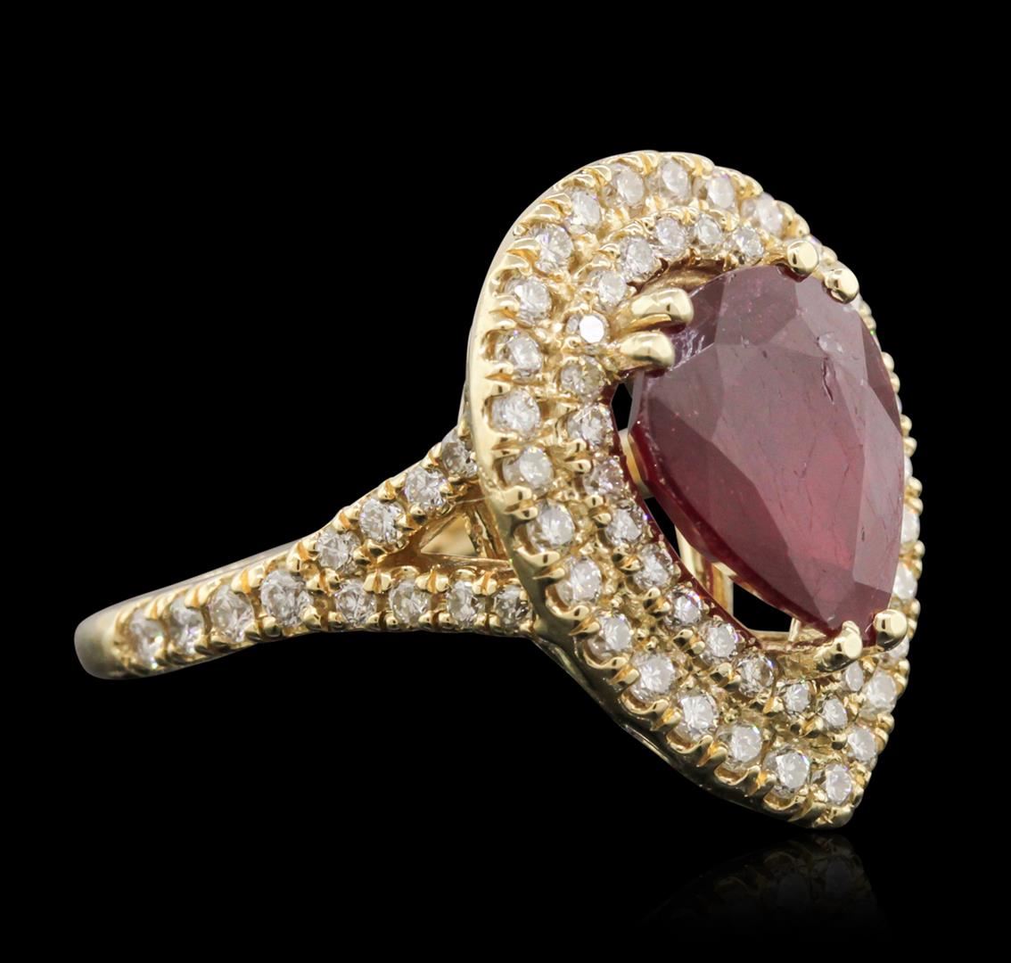 One electronically tested 14KT yellow gold Ladies combination cast & assembled ring with a bright polish finish. Condition is new. Identified with markings of "14K". Containing: One prong set pear modified brilliant cut natural ruby, measuring 10.90 x 8.94 x 5.50mm, approximate. Total Weight of 4.29ct., clarity is heavily included, type II, medium dark, moderately strong, strongly purplish red color, (GIA stpR 6/4), cut is good. Seventy-Eight prong set round brilliant cut diamonds, measuring 1.70 - 1.70 x 1.02mm (depth est.) approximate. Total Weight of 78 Stones = 1.40ct. Clarity: SI-1 to I-1. Color: K - L, Cut is Good. Colored gemstones are presumed to have been subjected to commonly used enhancement processes. All diamonds and colored gemstones are graded in the mounting, unless otherwise stated. Total Weight of Colored Stones 4.29ct. Total Weight of Diamonds 1.40ct. Total Weight of Ring 7.60 grams. GGL Appraised at $5,865.00.