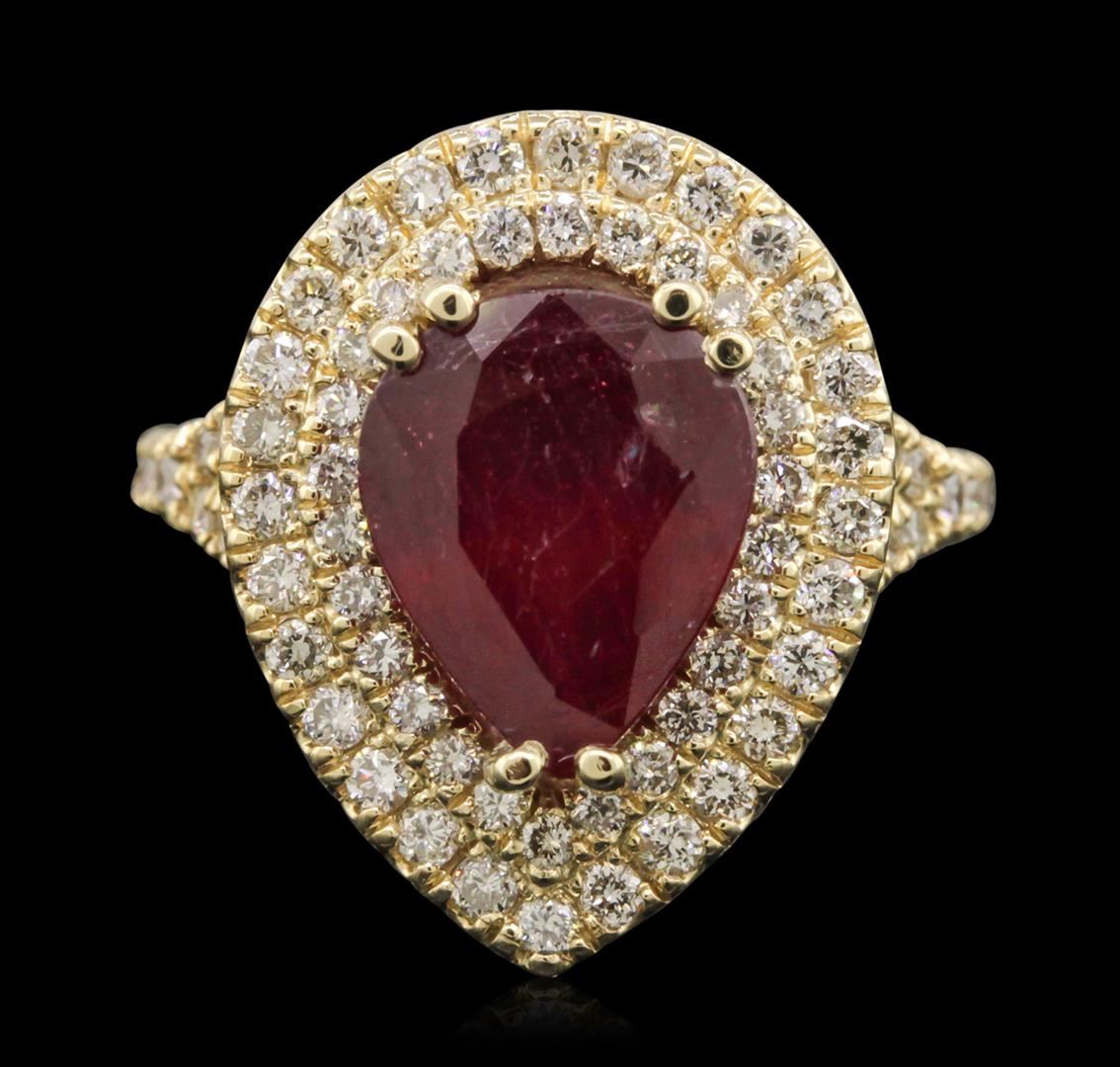 One electronically tested 14KT yellow gold Ladies combination cast & assembled ring with a bright polish finish. Condition is new. Identified with markings of "14K". Containing: One prong set pear modified brilliant cut natural ruby, measuring 10.90 x 8.94 x 5.50mm, approximate. Total Weight of 4.29ct., clarity is heavily included, type II, medium dark, moderately strong, strongly purplish red color, (GIA stpR 6/4), cut is good. Seventy-Eight prong set round brilliant cut diamonds, measuring 1.70 - 1.70 x 1.02mm (depth est.) approximate. Total Weight of 78 Stones = 1.40ct. Clarity: SI-1 to I-1. Color: K - L, Cut is Good. Colored gemstones are presumed to have been subjected to commonly used enhancement processes. All diamonds and colored gemstones are graded in the mounting, unless otherwise stated. Total Weight of Colored Stones 4.29ct. Total Weight of Diamonds 1.40ct. Total Weight of Ring 7.60 grams. GGL Appraised at $5,865.00.