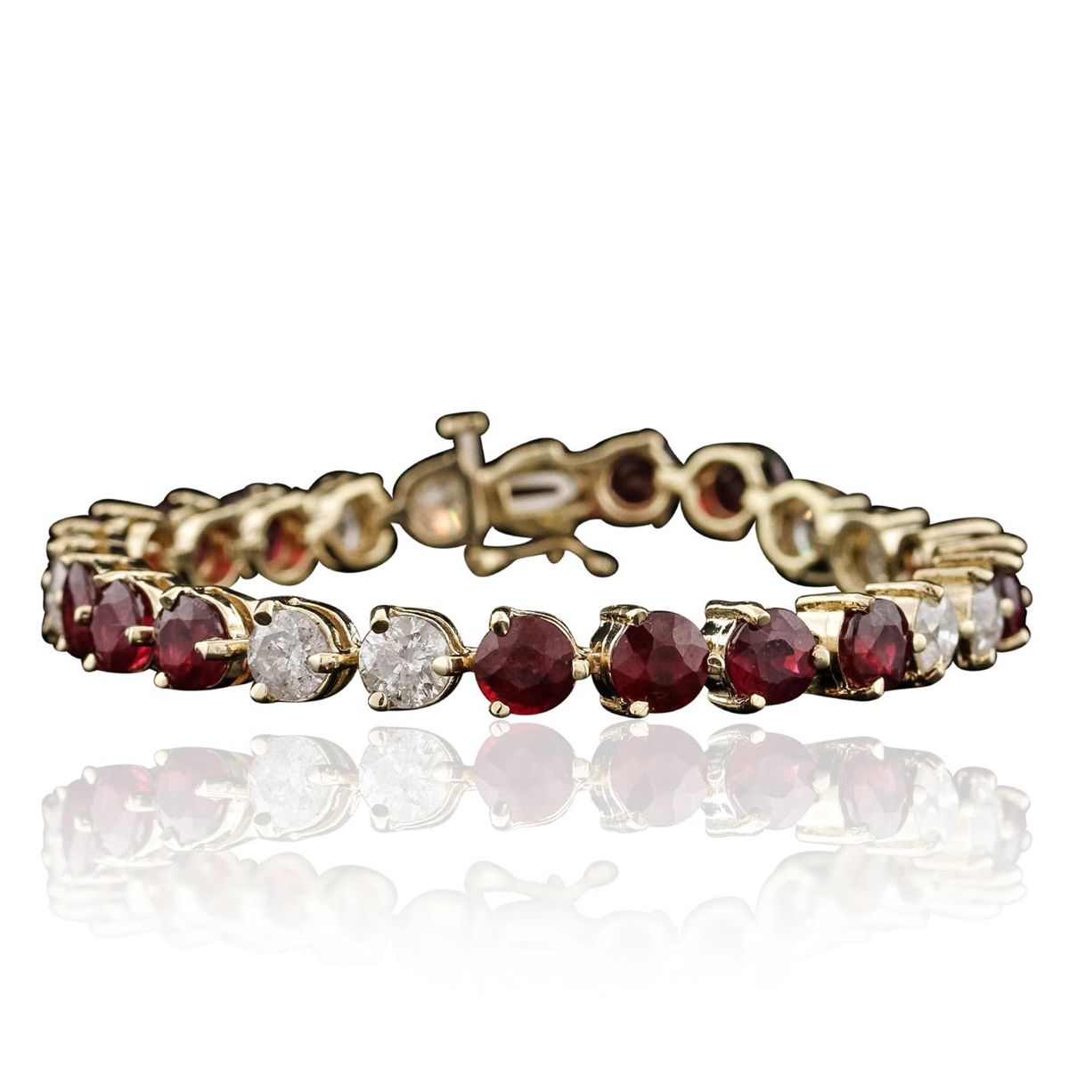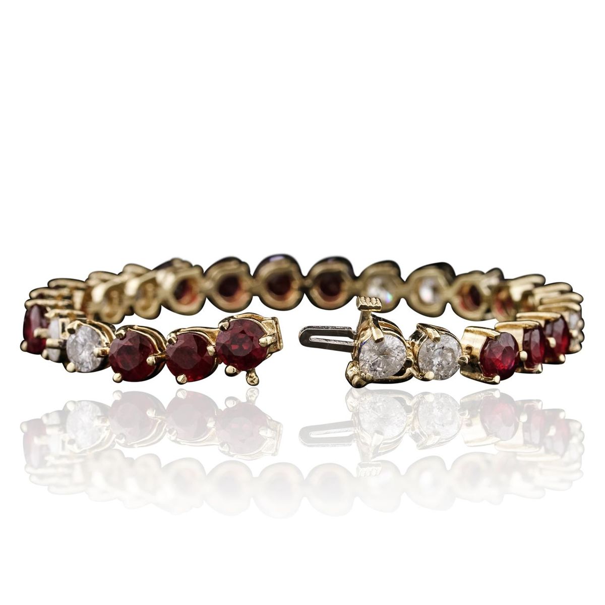 One electronically tested 14KT yellow gold ladies cast bracelet with a hidden box clap with a bright polish finish. Measurements: 7" in length Identified with markings of "14K". Condition is new. Containing: Sixteen prong set round modified brilliant cut natural rubies, measuring 5.90 - 5.90 x 3.84 mm, approximate total weight of 4.32ct., clarity is heavily included, medium dark, moderately strong, strongly purplish red color, (GIA stpR 6/4), cut is good. Ten prong set round brilliant cut diamonds, measuring 5.50 - 5.50 x 3.30mm (depth est.) approximate total weight of 10 Stones = 6.09ct. Clarity: I-1 to I-3. Color: H - I, Cut is Good. Colored gemstones are presumed to have been subjected to commonly used enhancement processes. All diamonds and colored gemstones are graded in the mounting, unless otherwise stated. Total Weight of Colored Stones 4.32ct. Total Weight of Diamonds 6.09ct. Total Weight of Ring 22.10 grams. GGL Appraised at $36,275.00.