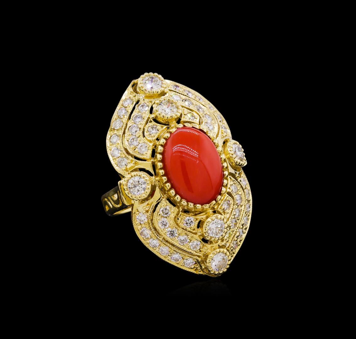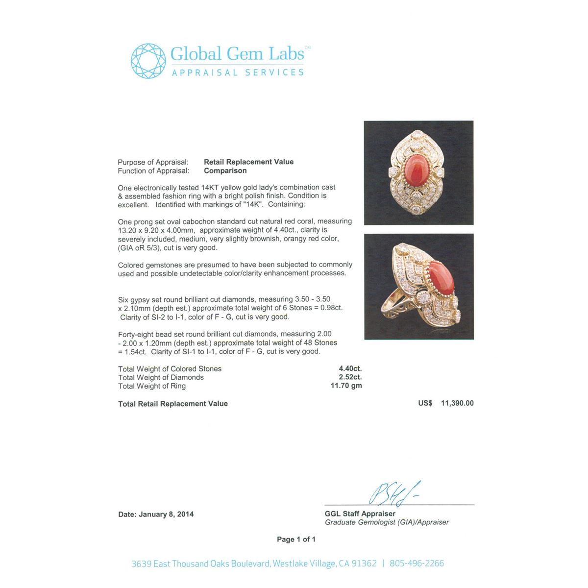 One electronically tested 14KT yellow gold Ladies combination cast & assembled fashion ring with a bright polish finish. Identified with markings of "14K". Condition is excellent. Containing: One prong set oval cabochon standard cut natural red coral, measuring 13.20 x 9.20 x 4.00mm, approximate weight of 4.40ct., clarity is severely included, medium, very slightly brownish, orangy red color, (GIA oR 5/3), cut is very good. Colored gemstones are presumed to have been subjected to commonly used and possible undetectable color/clarity enhancement processes. Six gypsy set round brilliant cut diamonds, measuring 3.50 - 3.50 x 2.10mm (depth est.) approximate total weight of 6 Stones = 0.98ct. Clarity of SI-2 to I-1, Color of F - G, Cut is Very Good. Forty-Eight bead set round brilliant cut diamonds, measuring 2.00 - 2.00 x 1.20mm (depth est.) approximate total weight of 48 Stones = 1.54ct. Clarity of SI-1 to I-1, Color of F - G, Cut is Very Good. Total Weight of Colored Stones 4.40ct. Total Weight of Diamonds 2.52ct. Total Weight of Ring 11.70gm. GGL Appraised at $11,390.00.