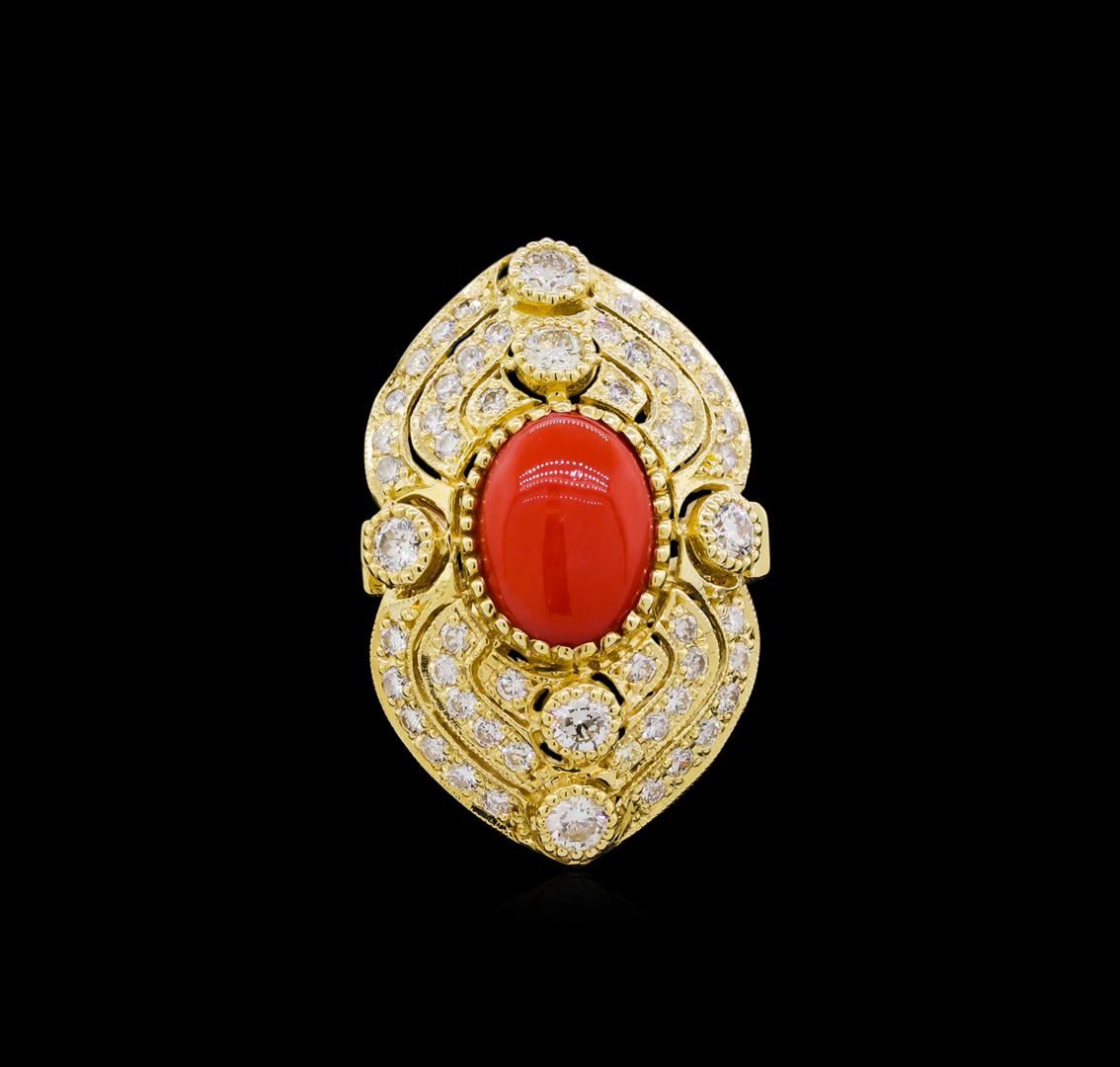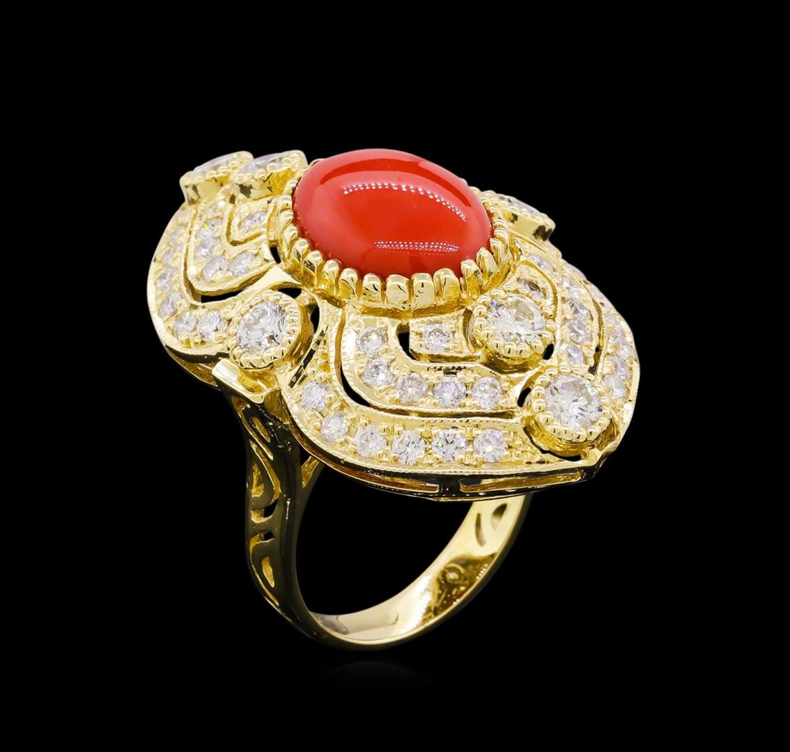 One electronically tested 14KT yellow gold Ladies combination cast & assembled fashion ring with a bright polish finish. Identified with markings of "14K". Condition is excellent. Containing: One prong set oval cabochon standard cut natural red coral, measuring 13.20 x 9.20 x 4.00mm, approximate weight of 4.40ct., clarity is severely included, medium, very slightly brownish, orangy red color, (GIA oR 5/3), cut is very good. Colored gemstones are presumed to have been subjected to commonly used and possible undetectable color/clarity enhancement processes. Six gypsy set round brilliant cut diamonds, measuring 3.50 - 3.50 x 2.10mm (depth est.) approximate total weight of 6 Stones = 0.98ct. Clarity of SI-2 to I-1, Color of F - G, Cut is Very Good. Forty-Eight bead set round brilliant cut diamonds, measuring 2.00 - 2.00 x 1.20mm (depth est.) approximate total weight of 48 Stones = 1.54ct. Clarity of SI-1 to I-1, Color of F - G, Cut is Very Good. Total Weight of Colored Stones 4.40ct. Total Weight of Diamonds 2.52ct. Total Weight of Ring 11.70gm. GGL Appraised at $11,390.00.