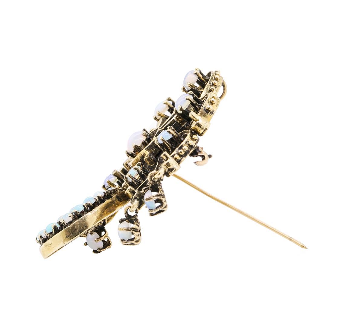 One electronically tested 14KT yellow gold lady's hand fabricated vintage fashion pendant-pin with a bright polish finish. The featured lady's pendant-pin has a straight pin connecting to a locking clutch. Identified with markings of '14K'. Condition is used, good workmanship. Containing: Thirteen crystal opals that are cut in a round shaped cabochon and are prong set, measuring 5.00 mm long x 4.00 mm wide, and 2.20 mm thick and the approximate weight is 3.51 carats. The opals have a exceptionally bright, multicolor play of color (fire) in a rolling flashfire pattern; a medium dome; a very good cut; no inclusions; consistent in their brightness and pattern; and are not directional. Graded in the setting. Fifteen crystal opals that are cut in a round shaped cabochon and are prong set, measuring 3.17 mm long x 2.00 mm wide, and 1.40 mm thick and the approximate weight is 0.90 carats. The opals have a exceptionally bright, multicolor play of color (fire) in a rolling flashfire pattern; a medium dome; a very good cut; no inclusions; consistent in their brightness and pattern; and are not directional. Graded in the setting. Total Weight of Opals 4.41ct. Total Weight of Pendant-Pin 17.80gm. GAS Appraised.