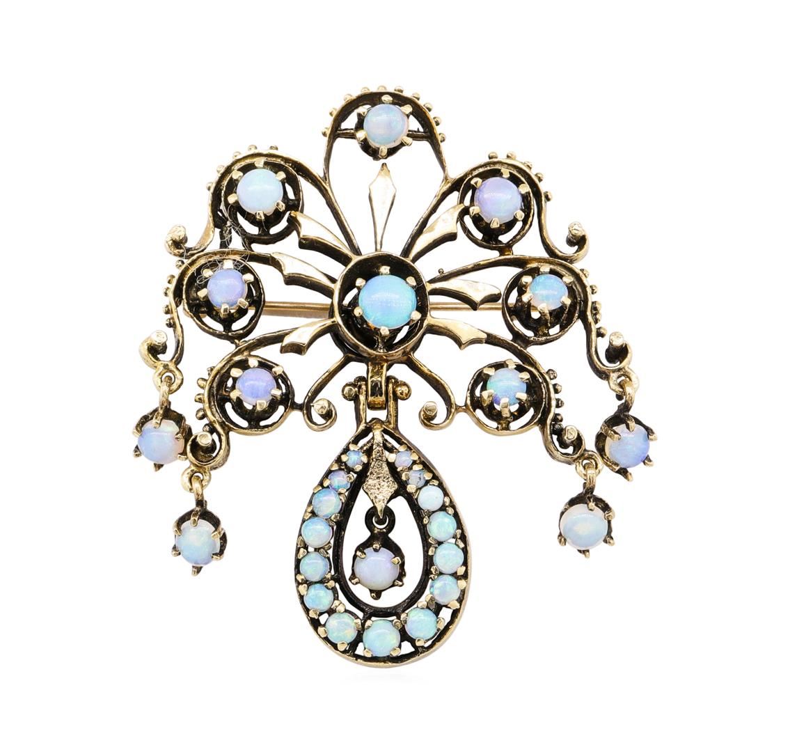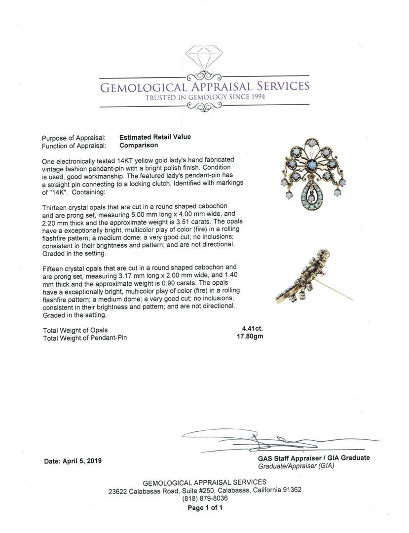 One electronically tested 14KT yellow gold lady's hand fabricated vintage fashion pendant-pin with a bright polish finish. The featured lady's pendant-pin has a straight pin connecting to a locking clutch. Identified with markings of '14K'. Condition is used, good workmanship. Containing: Thirteen crystal opals that are cut in a round shaped cabochon and are prong set, measuring 5.00 mm long x 4.00 mm wide, and 2.20 mm thick and the approximate weight is 3.51 carats. The opals have a exceptionally bright, multicolor play of color (fire) in a rolling flashfire pattern; a medium dome; a very good cut; no inclusions; consistent in their brightness and pattern; and are not directional. Graded in the setting. Fifteen crystal opals that are cut in a round shaped cabochon and are prong set, measuring 3.17 mm long x 2.00 mm wide, and 1.40 mm thick and the approximate weight is 0.90 carats. The opals have a exceptionally bright, multicolor play of color (fire) in a rolling flashfire pattern; a medium dome; a very good cut; no inclusions; consistent in their brightness and pattern; and are not directional. Graded in the setting. Total Weight of Opals 4.41ct. Total Weight of Pendant-Pin 17.80gm. GAS Appraised.