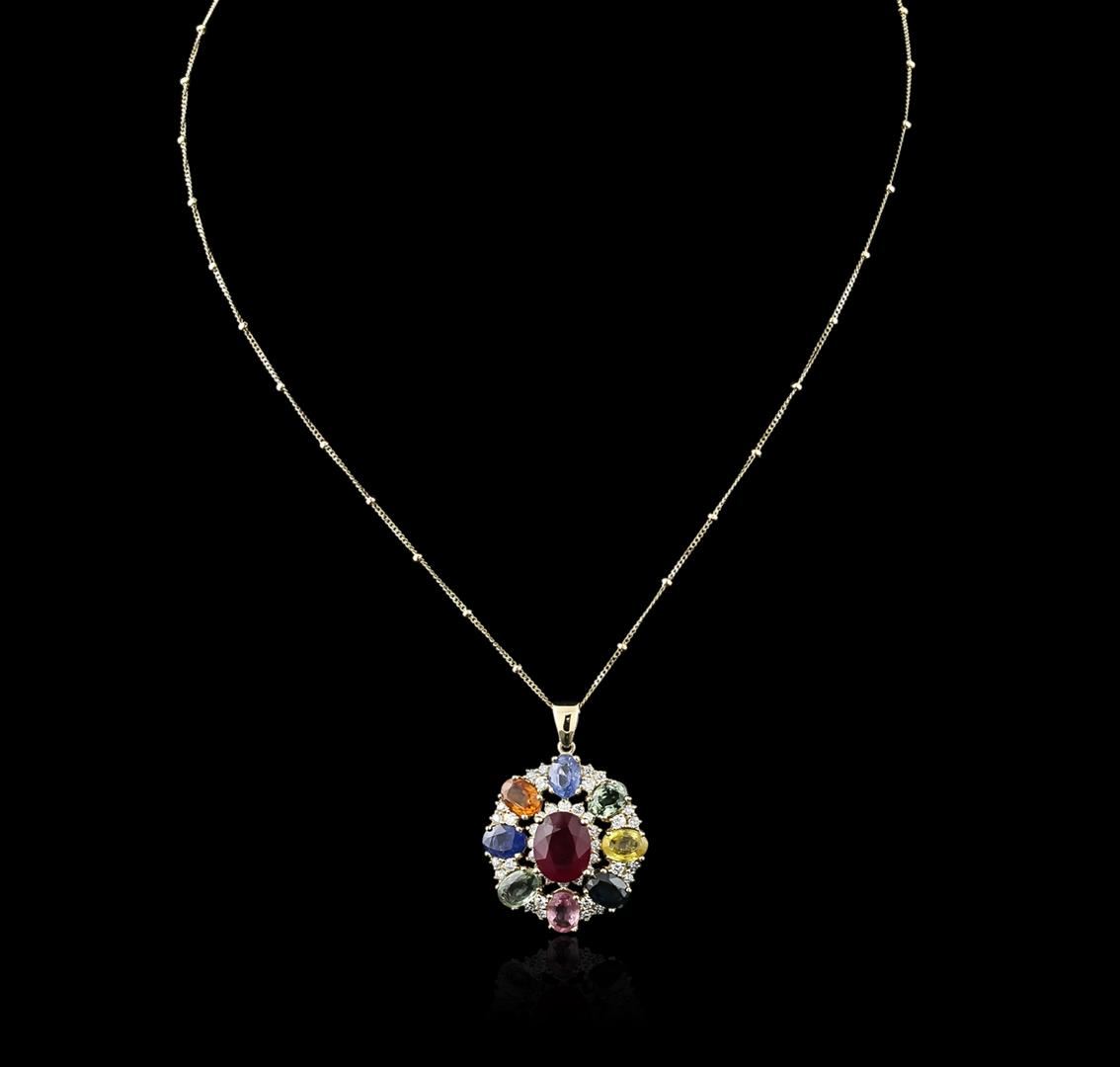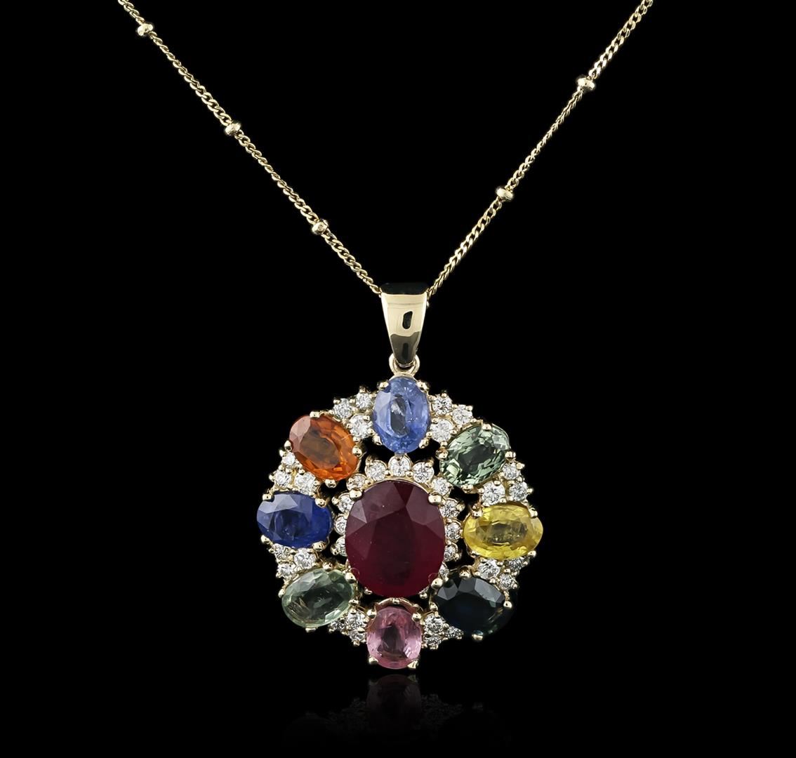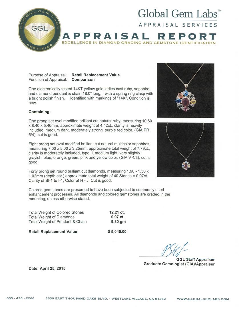 One electronically tested 14KT yellow gold ladies cast ruby, sapphire and diamond pendant & chain 18.0" long, with a spring ring clasp with a bright polish finish. Identified with markings of "14K". Condition is new. Containing: One prong set oval modified brilliant cut natural ruby, measuring 10.60 x 8.40 x 5.46mm, approximate weight of 4.42ct., clarity is heavily included, medium dark, moderately strong, purple red color, (GIA PR 6/4), cut is good. Eight prong set oval modified brilliant cut natural multicolor sapphires, measuring 7.00 x 5.00 x 3.25mm, approximate total weight of 7.79ct., clarity is moderately included, type II, medium light, very slightly grayish, blue, green, orange, pink and yellow color, (GIA V 4/3), cut is good. Forty prong set round brilliant cut diamonds, measuring 1.90 - 1.50 x 1.02mm (depth est.) approximate total weight of 40 Stones = 0.97ct. Clarity: SI-1 to I-1. Color: H - J, Cut is Good. Colored gemstones are presumed to have been subjected to commonly used enhancement processes. All diamonds and colored gemstones are graded in the mounting, unless otherwise stated. Total Weight of Colored Stones 12.21ct. Total Weight of Diamonds 0.97ct. Total Weight of Pendant & Chain 9.30 grams. GGL Appraised at $5,045.00.