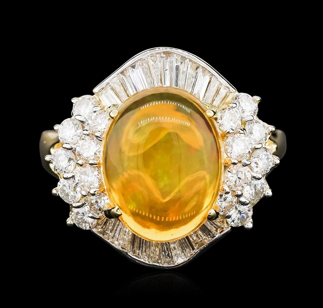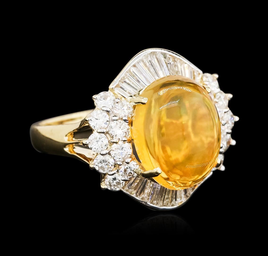 One electronically tested 14KT yellow gold ladies cast opal and diamond ring. The featured opal is set within a stylized diamond bezel supported by three-way split shoulders, completed by a two millimeter wide band. Bright polish finish with rhodium accents. Identified with markings of "14K". Condition is new, good workmanship. Containing: One jelly opal that is cut in a oval shaped cabochon and is prong set, measuring 12.00 mm long x 10.00 mm wide, and 5.48 mm thick and the approximate weight is 4.43 carats. The opal has a somewhat bright, orange-green play of color (fire) in a flashfire pattern; a high dome; a good cut; no inclusions; slight variation in base in its brightness and pattern; and is somewhat directional. Graded in the setting. Eighteen prong set round brilliant cut diamonds, measuring 2.30 - 2.20 x 1.35mm (depth est.) approximate total weight of 18 Stones = 0.85ct. Graded in the setting. Clarity: SI-2 to I-1. Color: F - H Twenty-Four channel set baguette cut diamonds, measuring from 2.40 x 1.10 x 0.77mm (depth est.) to 3.80 x 1.20 x 0.84mm (depth est.) approximate total weight of 24 Stones = 0.63ct. Graded in the setting. Clarity: VVS-2 to VS-2. Color: F - H. Total Weight of Diamonds 1.48ct. Total Weight of Opals 4.43ct. Total Weight of Ring 5.34 grams. AIG Appraised at $6,250.00.
