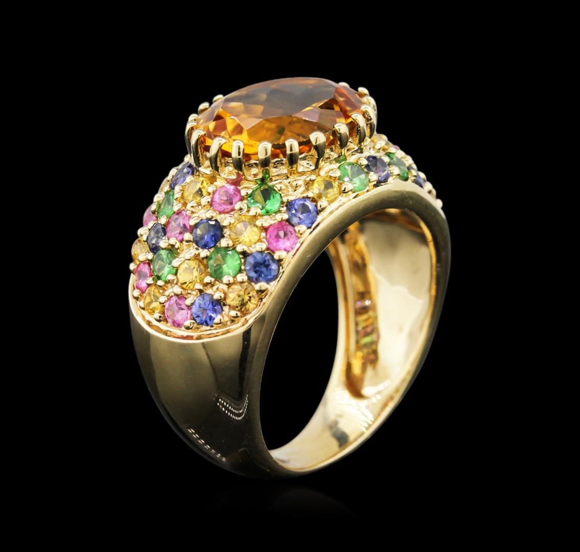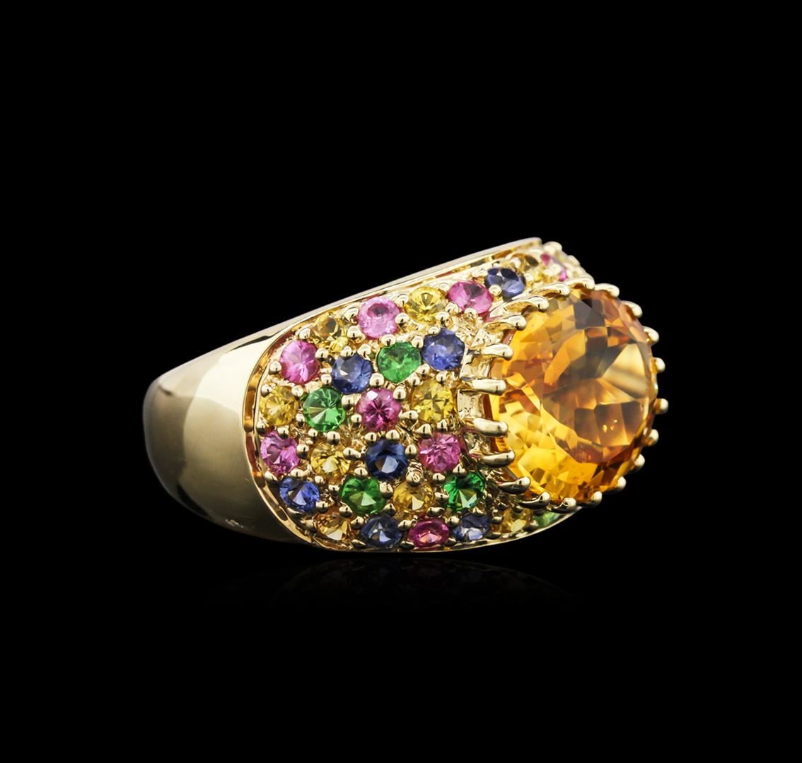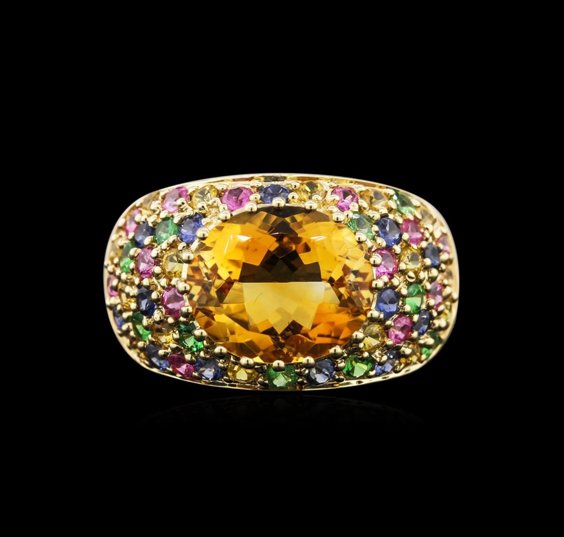 One ring featuring: 14KT yellow gold weighing 5.03 grams containing one citrine center stone with a total weight of 4.44ct, 13 pink sapphires with a total weight of 0.53ct, 13 blue sapphires with a total weight of 0.57ct, 16 yellow sapphires with a total weight of 0.64ct and ten tsavorites with a total weight of 0.39ct.