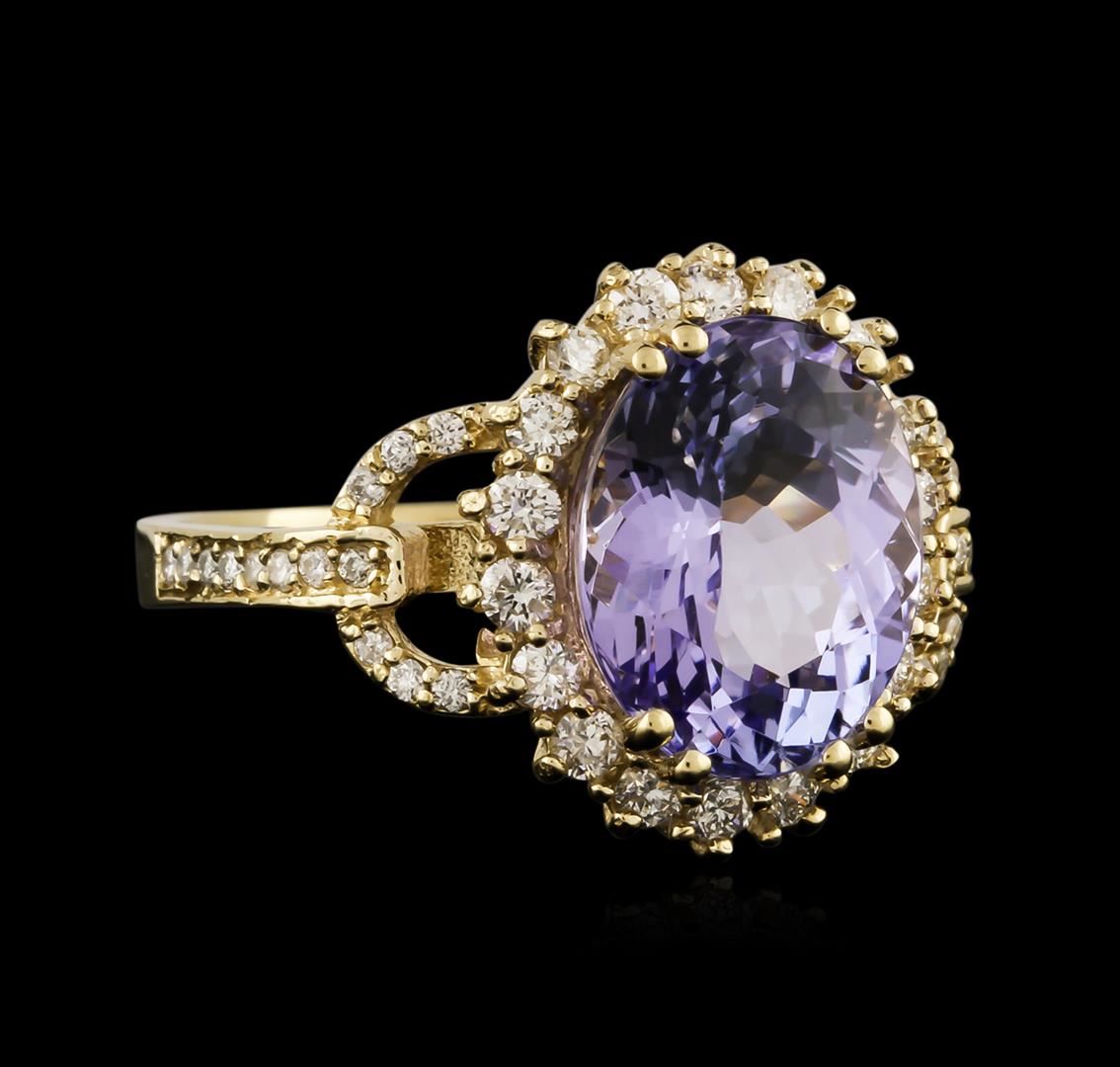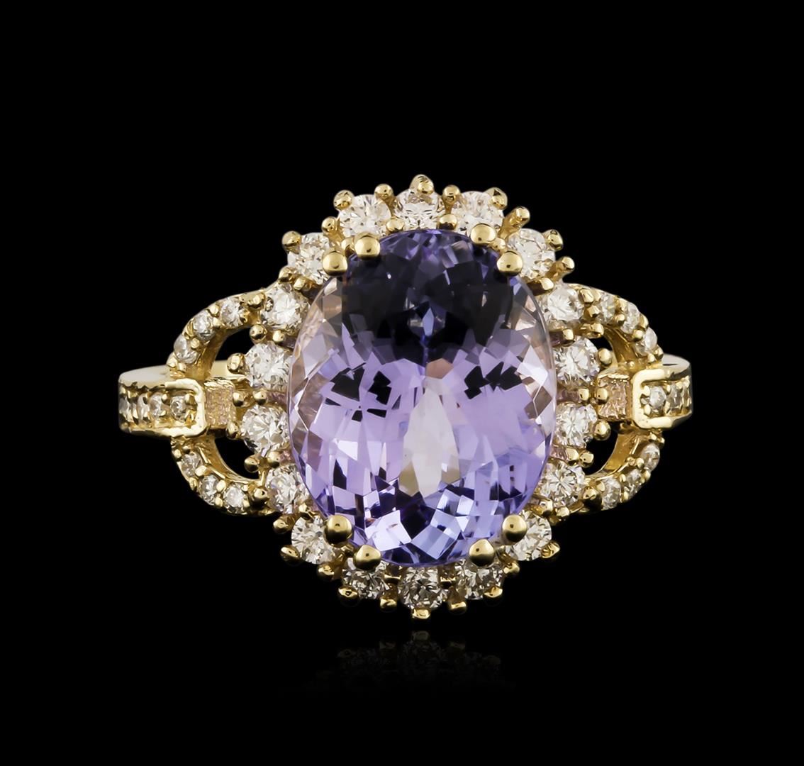 One electronically tested 14KT yellow gold ladies cast tanzanite and diamond ring with a bright polish finish. Identified with markings of "K14". Condition is new. Containing: One prong set oval modified brilliant cut natural tanzanite, measuring 11.50 x 9.20 x 5.98mm, approximate weight of 4.45ct., clarity is eye clean, type I, light, very slightly grayish, violet color, (GIA V 3/3), cut is good. Forty-Eight prong set round brilliant cut diamonds, measuring 2.00 - 1.30 x 0.99mm (depth est.) approximate total weight of 48 Stones = 0.79ct. Clarity: SI-1 to SI-2. Color: K - L, Cut is Good. Colored gemstones are presumed to have been subjected to commonly used enhancement processes. All diamonds and colored gemstones are graded in the mounting, unless otherwise stated. Total Weight of Colored Stones 4.45ct. Total Weight of Diamonds 0.79ct. Total Weight of Ring 4.40 grams. GGL Appraised at $4,860.00.