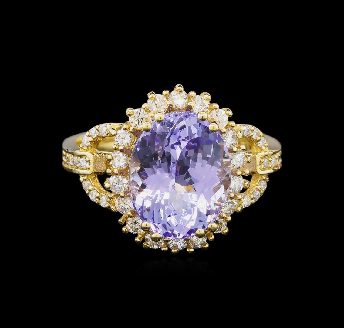 One electronically tested 14KT yellow gold ladies cast tanzanite and diamond ring with a bright polish finish. Identified with markings of "K14". Condition is new. Containing: One prong set oval modified brilliant cut natural tanzanite, measuring 11.50 x 9.20 x 5.98mm, approximate weight of 4.45ct., clarity is eye clean, type I, light, very slightly grayish, violet color, (GIA V 3/3), cut is good. Forty-Eight prong set round brilliant cut diamonds, measuring 2.00 - 1.30 x 0.99mm (depth est.) approximate total weight of 48 Stones = 0.79ct. Clarity: SI-1 to SI-2. Color: K - L, Cut is Good. Colored gemstones are presumed to have been subjected to commonly used enhancement processes. All diamonds and colored gemstones are graded in the mounting, unless otherwise stated. Total Weight of Colored Stones 4.45ct. Total Weight of Diamonds 0.79ct. Total Weight of Ring 4.40 grams. GGL Appraised at $4,860.00.