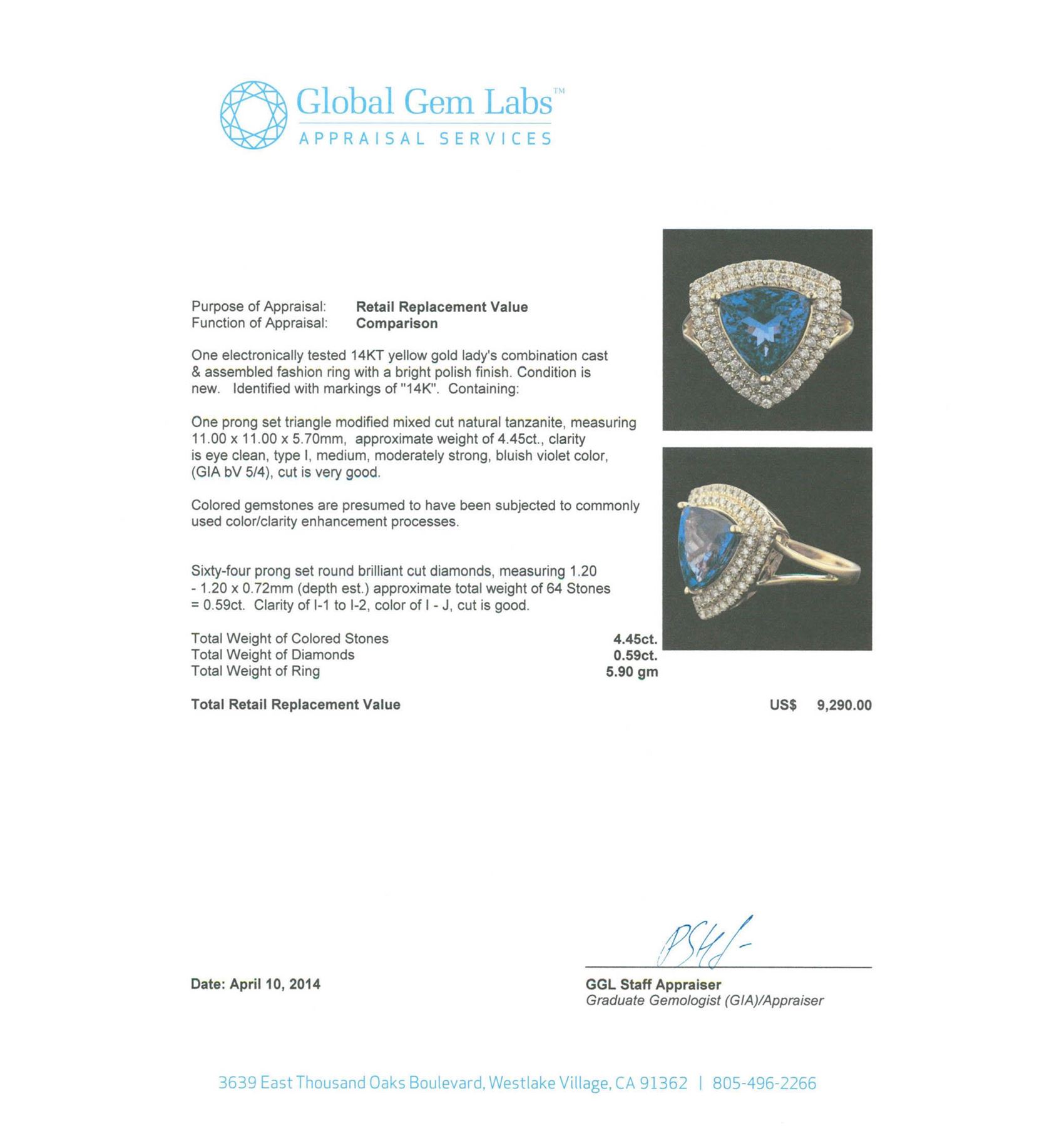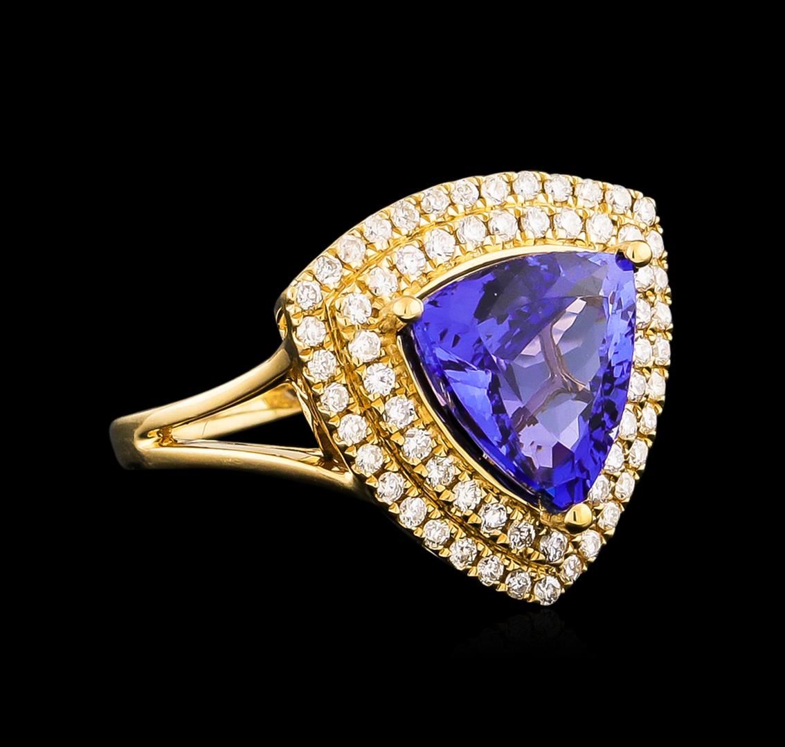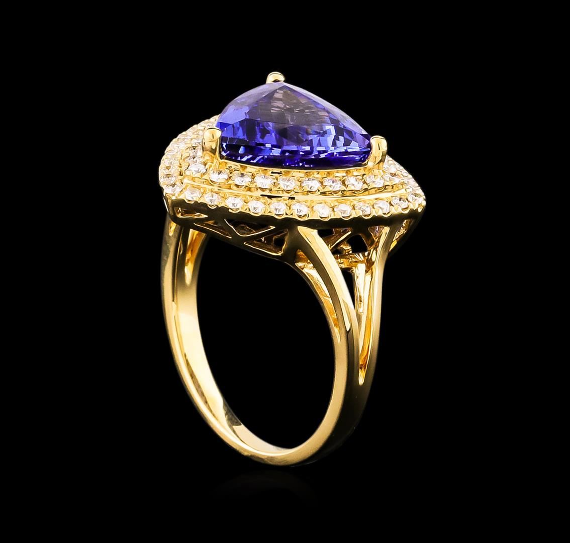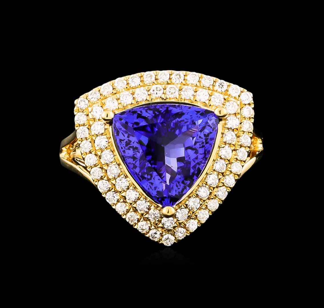 One electronically tested 14KT yellow gold Ladies combination cast & assembled fashion ring with a bright polish finish. Condition is new. Identified with markings of "14K". Containing: One prong set triangle modified mixed cut natural tanzanite, measuring 11.00 x 11.00 x 5.70mm, approximate weight of 4.45ct., clarity is eye clean, type I, medium, moderately strong, bluish violet color, (GIA bV 5/4), cut is very good. Colored gemstones are presumed to have been subjected to commonly used color/clarity enhancement processes. Sixty-Four prong set round brilliant cut diamonds, measuring 1.20 - 1.20 x 0.72mm (depth est.) approximate. Total Weight of 64 Stones = 0.59ct. Clarity: I-1 to I-2. Color: I - J, Cut is Good. Total Weight of Colored Stones 4.45ct. Total Weight of Diamonds 0.59ct. Total Weight of Ring 5.90 grams. GGL Appraised at $9,290.00.