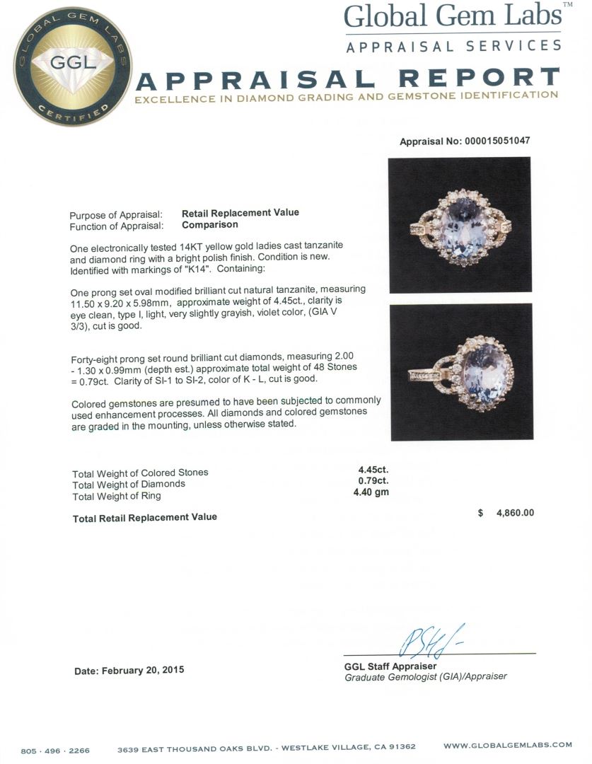 One electronically tested 14KT yellow gold ladies cast tanzanite and diamond ring with a bright polish finish. Identified with markings of "K14". Condition is new. Containing: One prong set oval modified brilliant cut natural tanzanite, measuring 11.50 x 9.20 x 5.98mm, approximate weight of 4.45ct., clarity is eye clean, type I, light, very slightly grayish, violet color, (GIA V 3/3), cut is good. Forty-Eight prong set round brilliant cut diamonds, measuring 2.00 - 1.30 x 0.99mm (depth est.) approximate total weight of 48 Stones = 0.79ct. Clarity: SI-1 to SI-2. Color: K - L, Cut is Good. Colored gemstones are presumed to have been subjected to commonly used enhancement processes. All diamonds and colored gemstones are graded in the mounting, unless otherwise stated. Total Weight of Colored Stones 4.45ct. Total Weight of Diamonds 0.79ct. Total Weight of Ring 4.40 grams. GGL Appraised at $4,860.00.