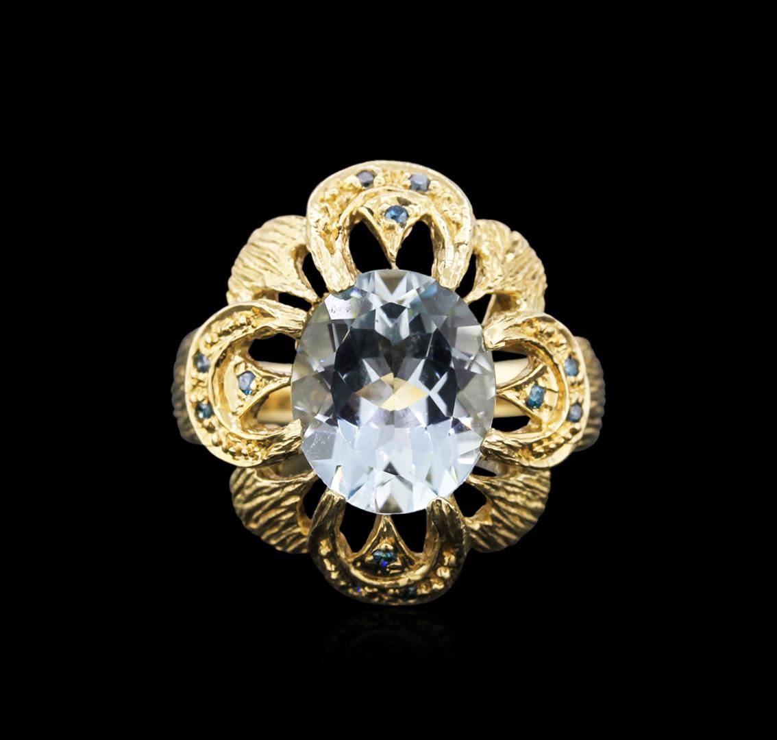 One ring featuring: 14KT yellow gold weighing 6.31 grams containing one aquamarine center stone with a total weight of 4.49ct and 12 blue diamonds with a total weight of 0.10ct.