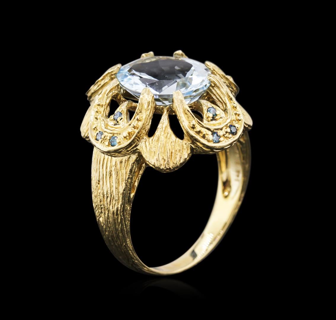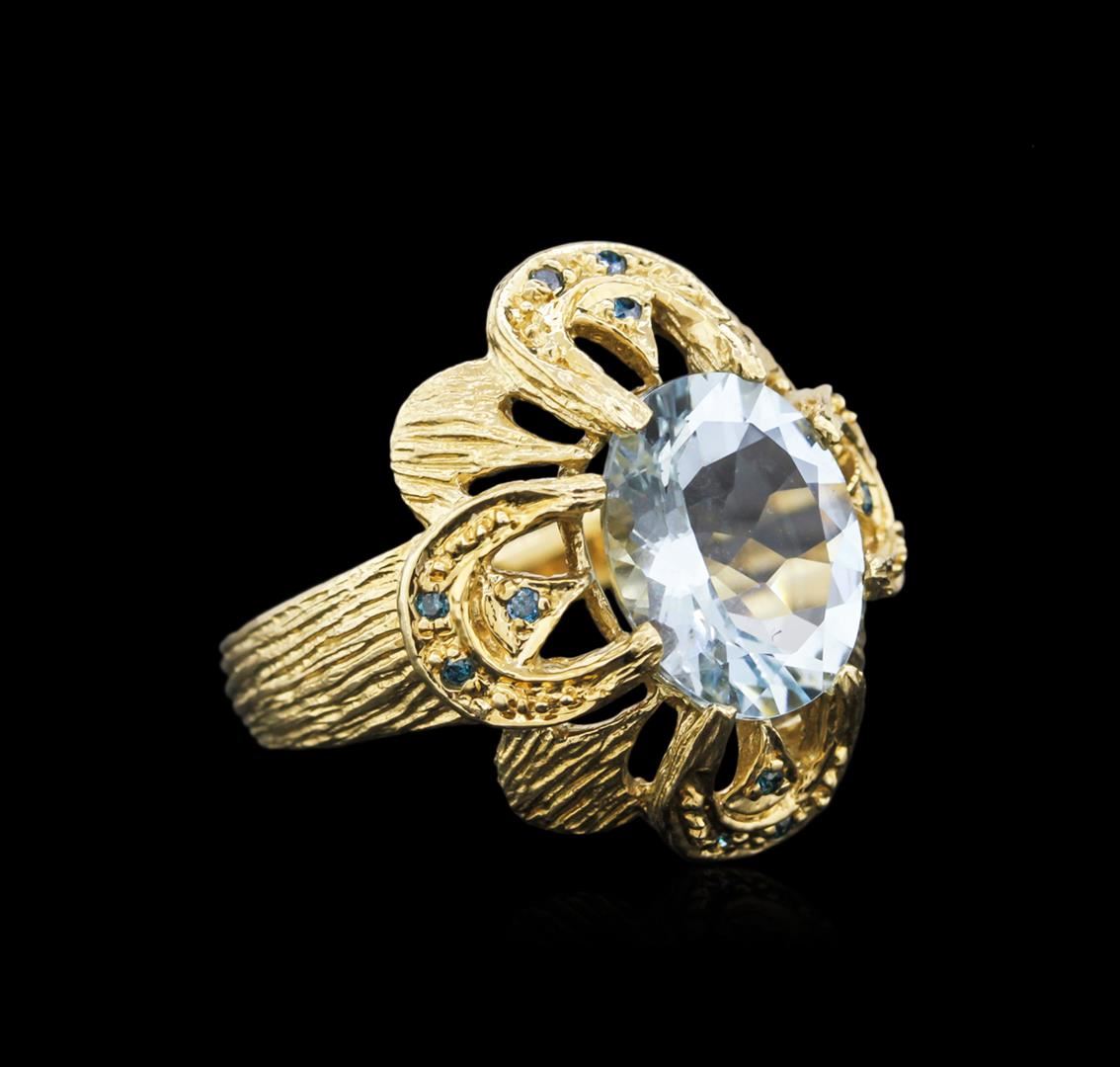 One ring featuring: 14KT yellow gold weighing 6.31 grams containing one aquamarine center stone with a total weight of 4.49ct and 12 blue diamonds with a total weight of 0.10ct.
