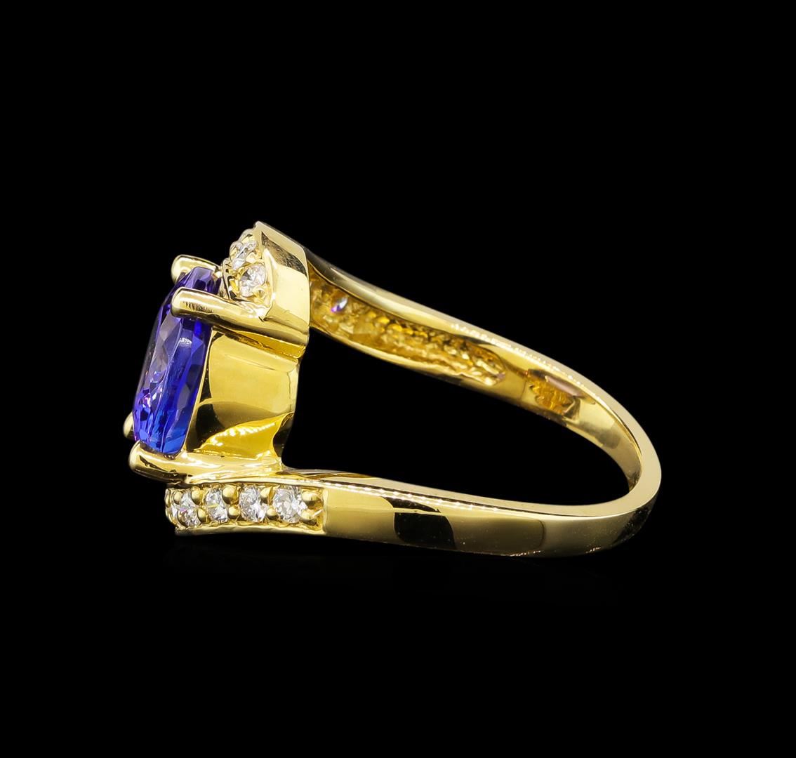 One electronically tested 14KT yellow gold ladies cast tanzanite and diamond ring with a bright polish finish. Identified with markings of "14K". Condition is new. Containing: One prong set oval modified brilliant cut natural tanzanite, measuring 11.24 x 9.26 x 6.13mm, approximate weight of 4.49ct., clarity is eye clean, type I, medium light, very slightly grayish, violet color, (GIA V 4/3), cut is good. Sixteen prong set round brilliant cut diamonds, measuring 1.60 - 1.60 x 0.96mm (depth est.) approximate total weight of 16 Stones = 0.24ct. Clarity: SI-2 to I-1. Color: I - J, Cut is Good. Colored gemstones are presumed to have been subjected to commonly used enhancement processes. All diamonds and colored gemstones are graded in the mounting, unless otherwise stated. Total Weight of Colored Stones 4.49ct. Total Weight of Diamonds 0.24ct. Total Weight of Ring 5.30 grams. GGL Appraised at $4,740.00.