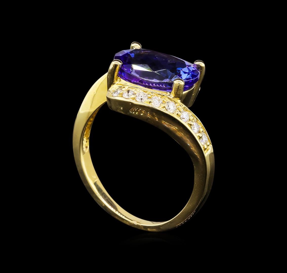 One electronically tested 14KT yellow gold ladies cast tanzanite and diamond ring with a bright polish finish. Identified with markings of "14K". Condition is new. Containing: One prong set oval modified brilliant cut natural tanzanite, measuring 11.24 x 9.26 x 6.13mm, approximate weight of 4.49ct., clarity is eye clean, type I, medium light, very slightly grayish, violet color, (GIA V 4/3), cut is good. Sixteen prong set round brilliant cut diamonds, measuring 1.60 - 1.60 x 0.96mm (depth est.) approximate total weight of 16 Stones = 0.24ct. Clarity: SI-2 to I-1. Color: I - J, Cut is Good. Colored gemstones are presumed to have been subjected to commonly used enhancement processes. All diamonds and colored gemstones are graded in the mounting, unless otherwise stated. Total Weight of Colored Stones 4.49ct. Total Weight of Diamonds 0.24ct. Total Weight of Ring 5.30 grams. GGL Appraised at $4,740.00.
