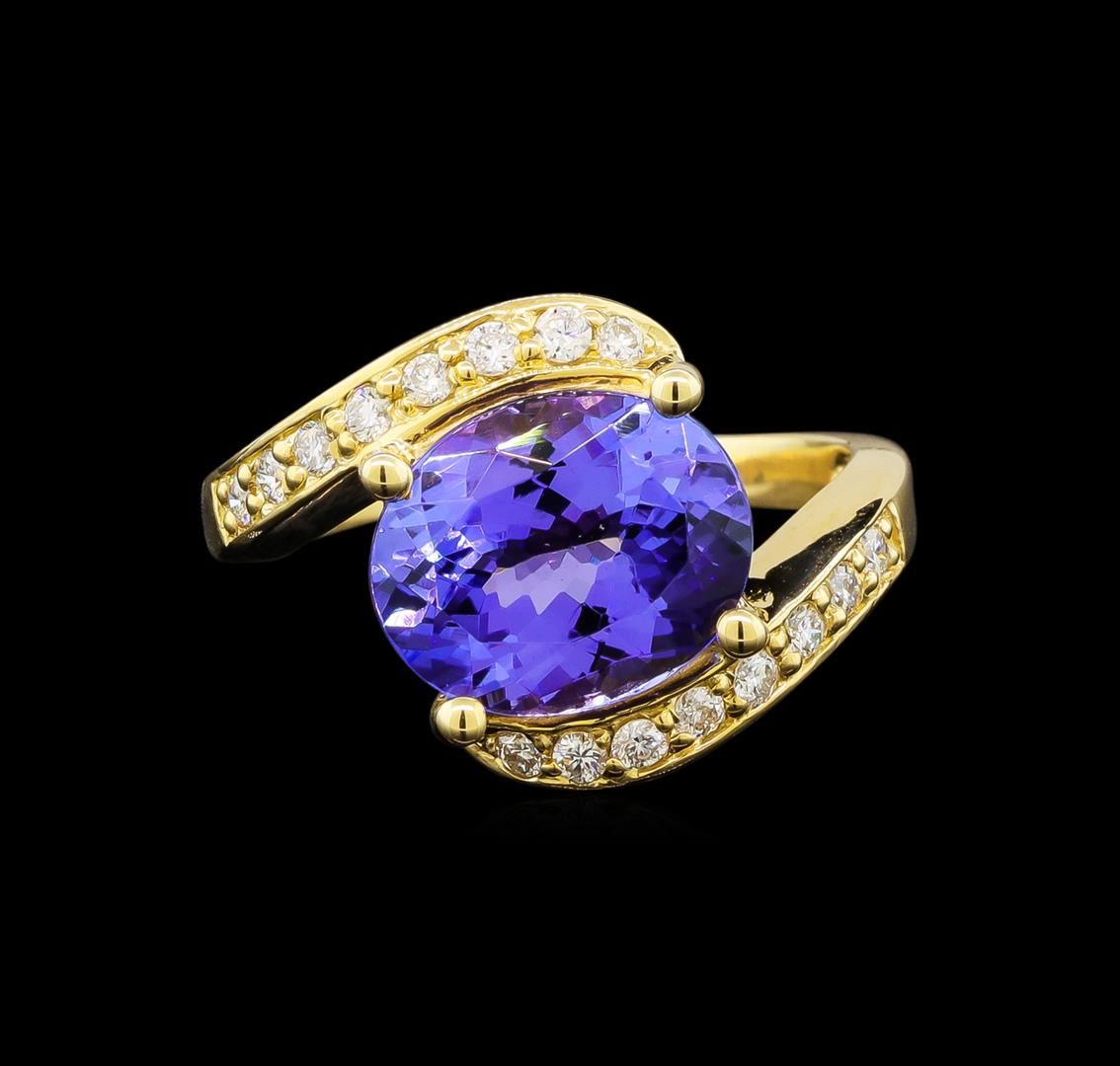 One electronically tested 14KT yellow gold ladies cast tanzanite and diamond ring with a bright polish finish. Identified with markings of "14K". Condition is new. Containing: One prong set oval modified brilliant cut natural tanzanite, measuring 11.24 x 9.26 x 6.13mm, approximate weight of 4.49ct., clarity is eye clean, type I, medium light, very slightly grayish, violet color, (GIA V 4/3), cut is good. Sixteen prong set round brilliant cut diamonds, measuring 1.60 - 1.60 x 0.96mm (depth est.) approximate total weight of 16 Stones = 0.24ct. Clarity: SI-2 to I-1. Color: I - J, Cut is Good. Colored gemstones are presumed to have been subjected to commonly used enhancement processes. All diamonds and colored gemstones are graded in the mounting, unless otherwise stated. Total Weight of Colored Stones 4.49ct. Total Weight of Diamonds 0.24ct. Total Weight of Ring 5.30 grams. GGL Appraised at $4,740.00.