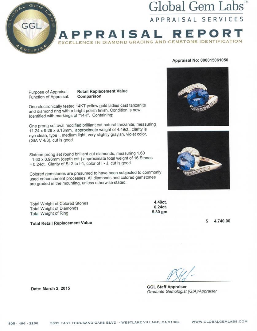 One electronically tested 14KT yellow gold ladies cast tanzanite and diamond ring with a bright polish finish. Identified with markings of "14K". Condition is new. Containing: One prong set oval modified brilliant cut natural tanzanite, measuring 11.24 x 9.26 x 6.13mm, approximate weight of 4.49ct., clarity is eye clean, type I, medium light, very slightly grayish, violet color, (GIA V 4/3), cut is good. Sixteen prong set round brilliant cut diamonds, measuring 1.60 - 1.60 x 0.96mm (depth est.) approximate total weight of 16 Stones = 0.24ct. Clarity: SI-2 to I-1. Color: I - J, Cut is Good. Colored gemstones are presumed to have been subjected to commonly used enhancement processes. All diamonds and colored gemstones are graded in the mounting, unless otherwise stated. Total Weight of Colored Stones 4.49ct. Total Weight of Diamonds 0.24ct. Total Weight of Ring 5.30 grams. GGL Appraised at $4,740.00.