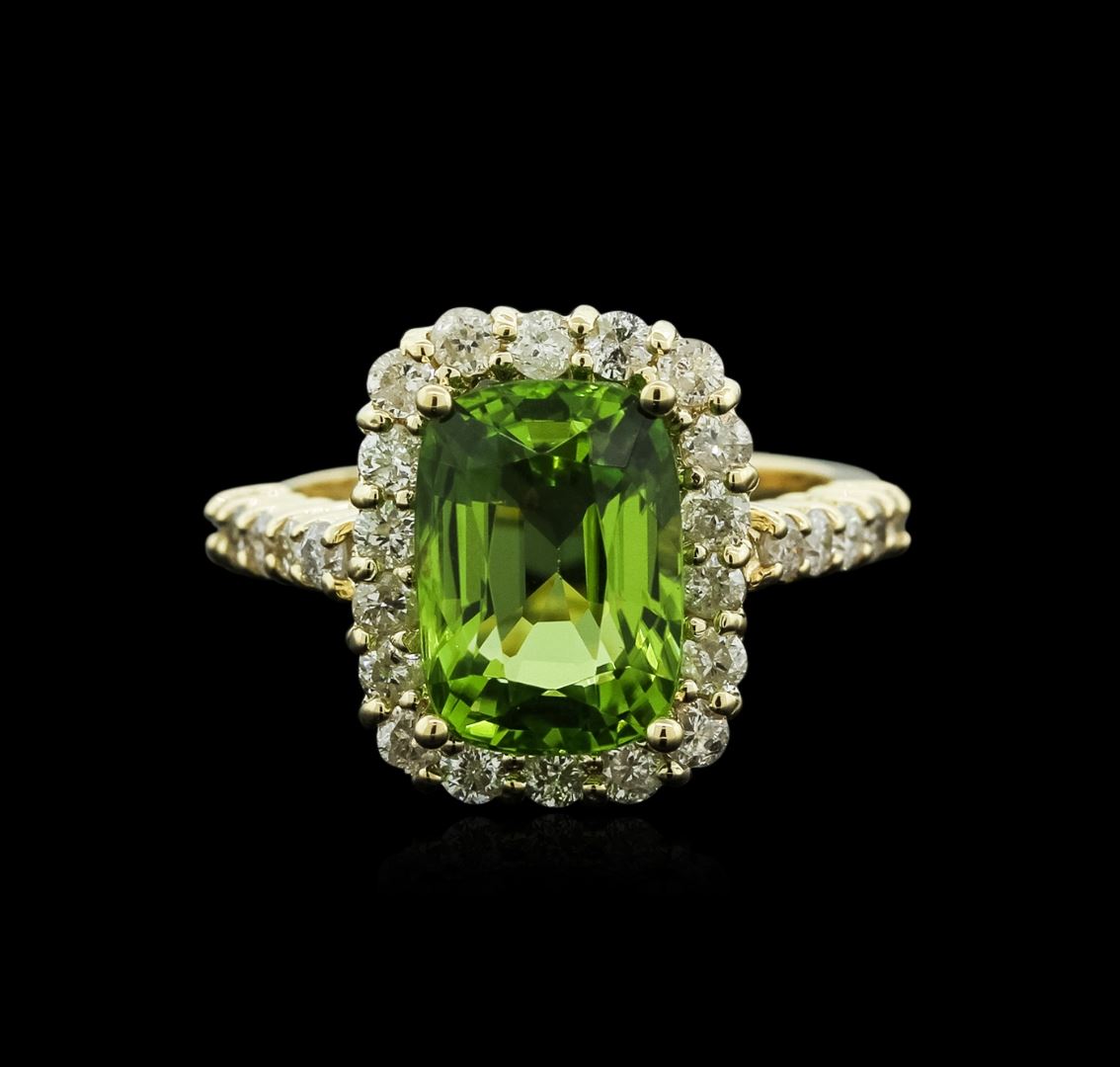 One polished, stamped, and tested solid 14K yellow gold ring mounted with: 1 genuine peridot center stone weighing 4.50 carat, and 28 genuine round diamonds weighing 1.01 carats. This item weighs 5.8 grams, condition is new, excellent workmanship. MAIN GEMSTONE: Identity: Natural Peridot. Species: Peridot. Shape: Cushion. Cutting Style: Brilliant Cut Crown Step Cut Pavilion. Measurements: 11.04 x 7.83 x 6.32 mm. Weight: 4.50 carat. Color: Yellowish Green. Cut Grade: Very Good. Refractive Index: 1.654 to 1.690 (+/-0.020) DR. Birefringence: 0.035 to 0.038. Hardness: 6.5-. ADJACENT GEMSTONES ON RING: Identity: Natural Diamond. Shape: Round. Cutting Style: Brilliant Cut. Quantity: 28 Diamonds. Measurements: 1.8 - 2.0 mm. Total Weight: 1.01 carats. Clarity Grade: SI1 - SI3. Color Grade: H - I. Refractive Index: 2.418. Hardness: 10. Peridot Weight: 4.50 ct. Total Diamond Weight: 1.01 cts. Weight of Item: 5.8 grams. Gold Content: 14K Yellow Gold. AIGL Appraised at $6,887.00.