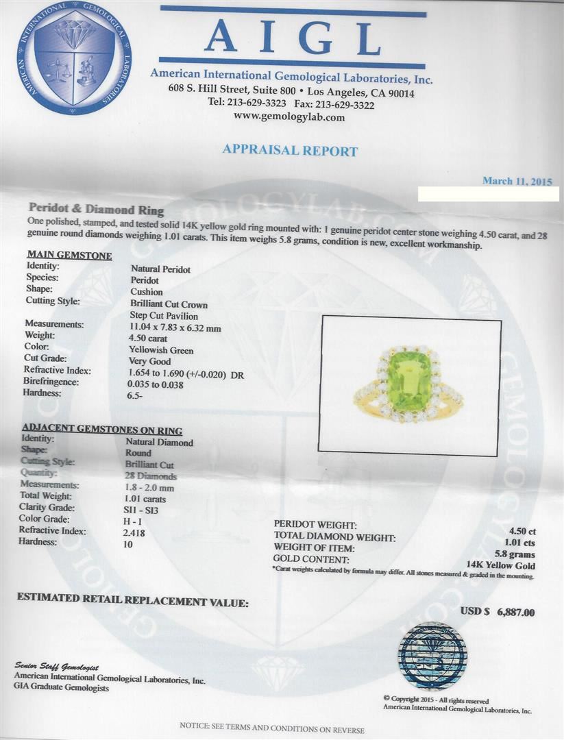 One polished, stamped, and tested solid 14K yellow gold ring mounted with: 1 genuine peridot center stone weighing 4.50 carat, and 28 genuine round diamonds weighing 1.01 carats. This item weighs 5.8 grams, condition is new, excellent workmanship. MAIN GEMSTONE: Identity: Natural Peridot. Species: Peridot. Shape: Cushion. Cutting Style: Brilliant Cut Crown Step Cut Pavilion. Measurements: 11.04 x 7.83 x 6.32 mm. Weight: 4.50 carat. Color: Yellowish Green. Cut Grade: Very Good. Refractive Index: 1.654 to 1.690 (+/-0.020) DR. Birefringence: 0.035 to 0.038. Hardness: 6.5-. ADJACENT GEMSTONES ON RING: Identity: Natural Diamond. Shape: Round. Cutting Style: Brilliant Cut. Quantity: 28 Diamonds. Measurements: 1.8 - 2.0 mm. Total Weight: 1.01 carats. Clarity Grade: SI1 - SI3. Color Grade: H - I. Refractive Index: 2.418. Hardness: 10. Peridot Weight: 4.50 ct. Total Diamond Weight: 1.01 cts. Weight of Item: 5.8 grams. Gold Content: 14K Yellow Gold. AIGL Appraised at $6,887.00.