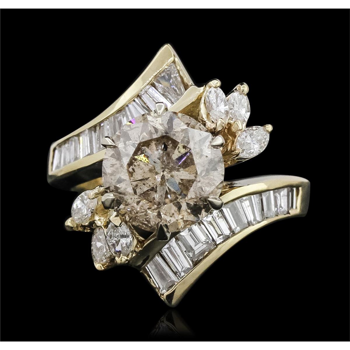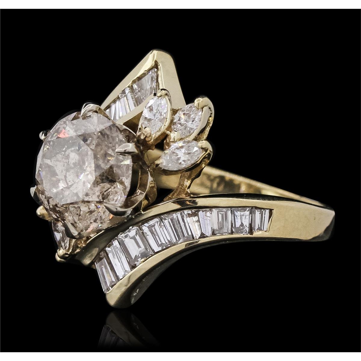 One electronically tested 14KT yellow gold ladies cast & assembled diamond ring with a bright polish finish. The featured diamond is set within a stylized diamond set bypass design, completed by a two millimeter wide band. Identified with markings of "14K". Condition is good. Containing: One prong set round brilliant cut diamond, measuring 9.25 - 9.20 x 5.85mm (depth est.) approximate weight of 3.13ct with a faint blue fluorescence. Graded in the setting. Clarity: I-2 . Depth: 63.4%. Table 60.7%. Six prong set marquise shaped cut diamonds, measuring 3.50 x 2.10 x 1.32mm (depth est.) approximate total weight of 6 Stones = 0.43ct. Graded in the setting. Clarity: VS-2 to SI-1. Color: G - I. Eighteen channel set baguette cut (tapered) diamonds, measuring from 2.30 x 1.50 x 1.05mm (depth est.) to 3.50 x 1.70 x 1.19mm (depth est.) approximate total weight of 18 Stones = 0.95ct. Graded in the setting. Clarity: VS-2 to SI-2 . Color: G - I. Total Weight of Diamonds 4.51ct. Total Weight of Ring 7.32 grams. AIG Appraised at $26,320.00.