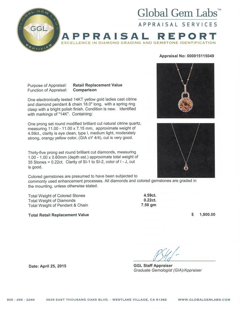 One electronically tested 14KT yellow gold ladies cast citrine and diamond pendant & chain 18.0" long, with a spring ring clasp with a bright polish finish. Identified with markings of "14K". Condition is new. Containing: One prong set round modified brilliant cut natural citrine quartz, measuring 11.00 - 11.00 x 7.15 mm, approximate weight of 4.59ct., clarity is eye clean, type I, medium light, moderately strong, orangy yellow color, (GIA oY 4/4), cut is very good. Thirty-Five prong set round brilliant cut diamonds, measuring 1.00 - 1.00 x 0.60mm (depth est.) approximate total weight of 35 Stones = 0.22ct. Clarity: SI-1 to SI-2. Color: I - J, Cut is Good. Colored gemstones are presumed to have been subjected to commonly used enhancement processes. All diamonds and colored gemstones are graded in the mounting, unless otherwise stated. Total Weight of Colored Stones 4.59ct. Total Weight of Diamonds 0.22ct. Total Weight of Pendant & Chain 7.50 grams. GGL Appraised at $1,800.00.
