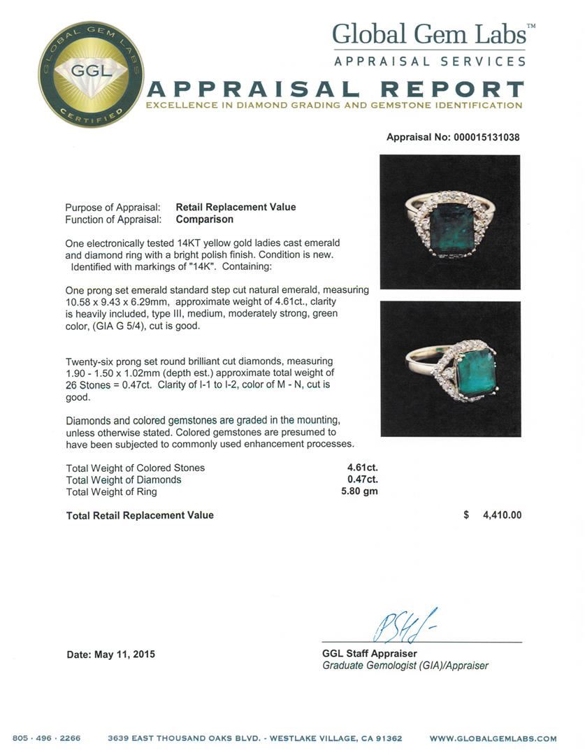One electronically tested 14KT yellow gold ladies cast emerald and diamond ring with a bright polish finish. Identified with markings of "14K". Condition is new. Containing: One prong set emerald standard step cut natural emerald, measuring 10.58 x 9.43 x GGL Appraised at $4,410.00.
