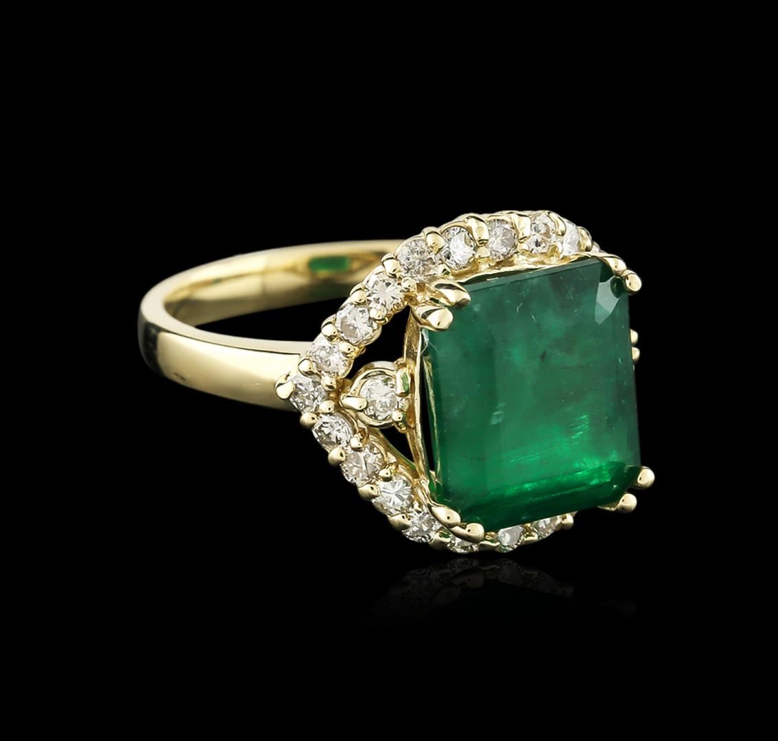 One electronically tested 14KT yellow gold ladies cast emerald and diamond ring with a bright polish finish. Identified with markings of "14K". Condition is new. Containing: One prong set emerald standard step cut natural emerald, measuring 10.58 x 9.43 x 6.29mm, approximate weight of 4.61ct., clarity is heavily included, type III, medium, moderately strong, green color, (GIA G 5/4), cut is good. Twenty-Six prong set round brilliant cut diamonds, measuring 1.90 - 1.50 x 1.02mm (depth est.) approximate total weight of 26 Stones = 0.47ct. Clarity: I-1 to I-2. Color: M - N, Cut is Good. Diamonds and colored gemstones are graded in the mounting, unless otherwise stated. Colored gemstones are presumed to have been subjected to commonly used enhancement processes. Total Weight of Colored Stones 4.61ct. Total Weight of Diamonds 0.47ct. Total Weight of Ring 5.80 grams. GGL Appraised at $4,410.00.