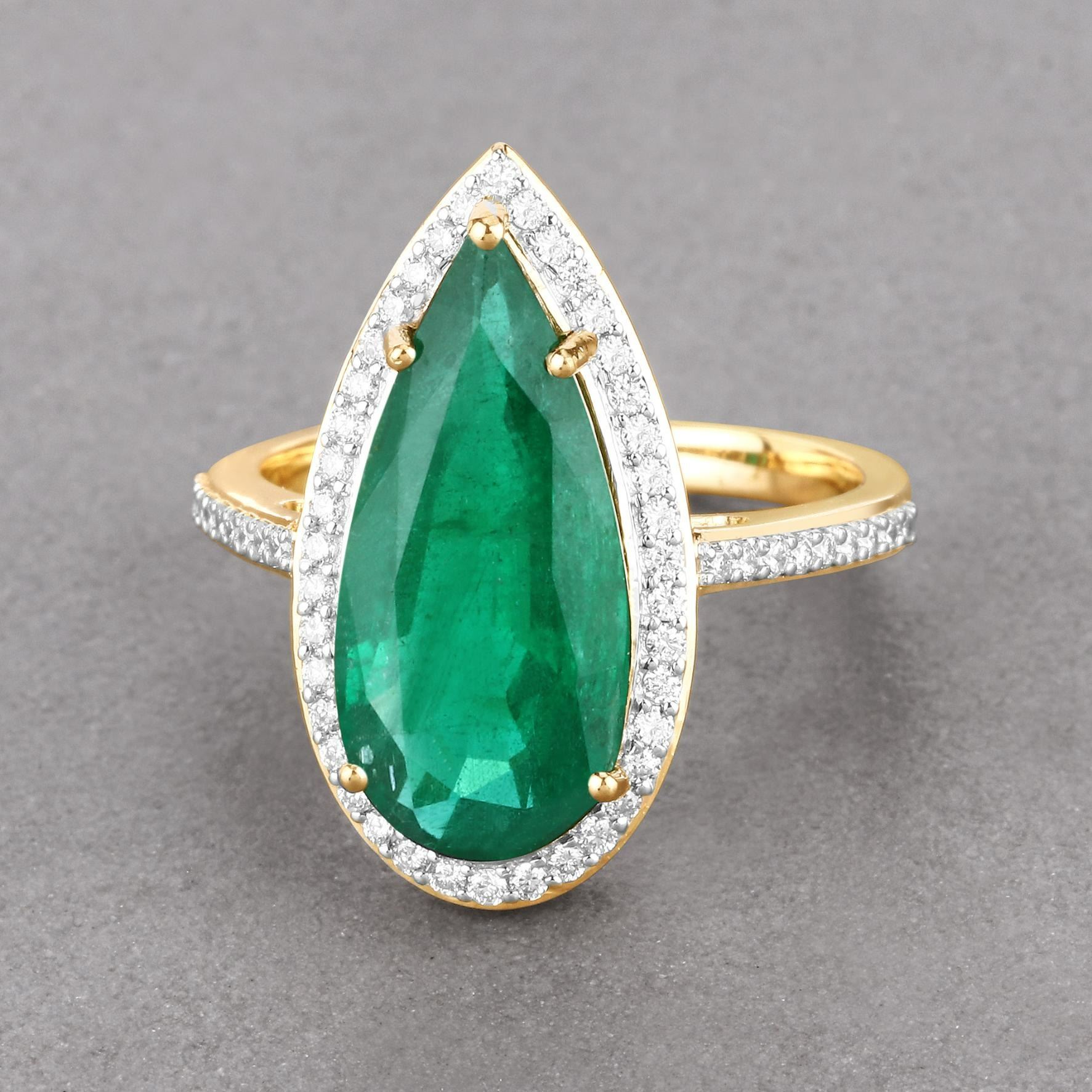 Zambian Emerald Pear 18.50 x8.50mm - 1Pc with a total weight of 4.62cts. Diamond White Round 1.10mm - 58Pcs ( SI/G-H ) with a total weight of 0.38cts. Total weight of ring is 4.75 grams. Ring size 7.