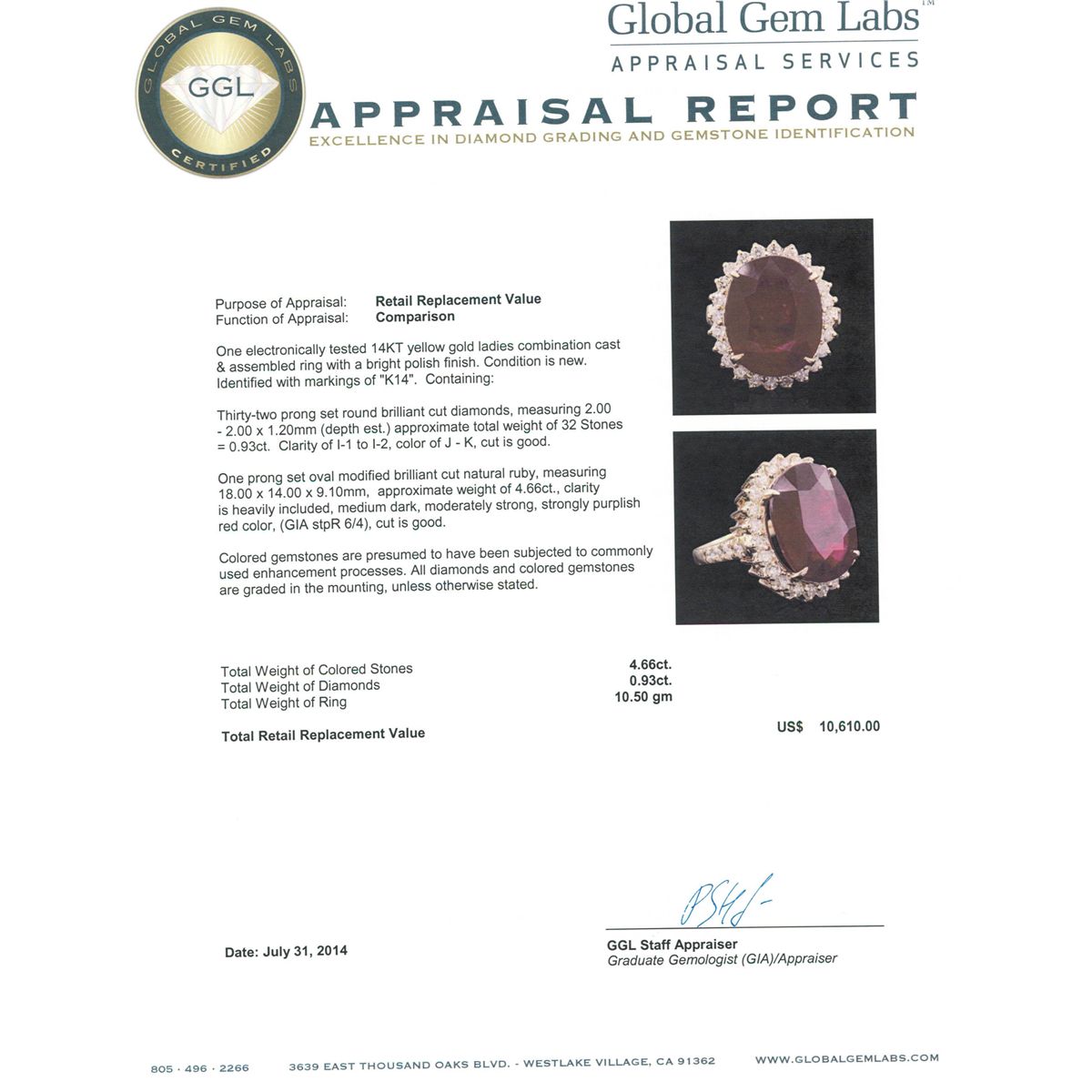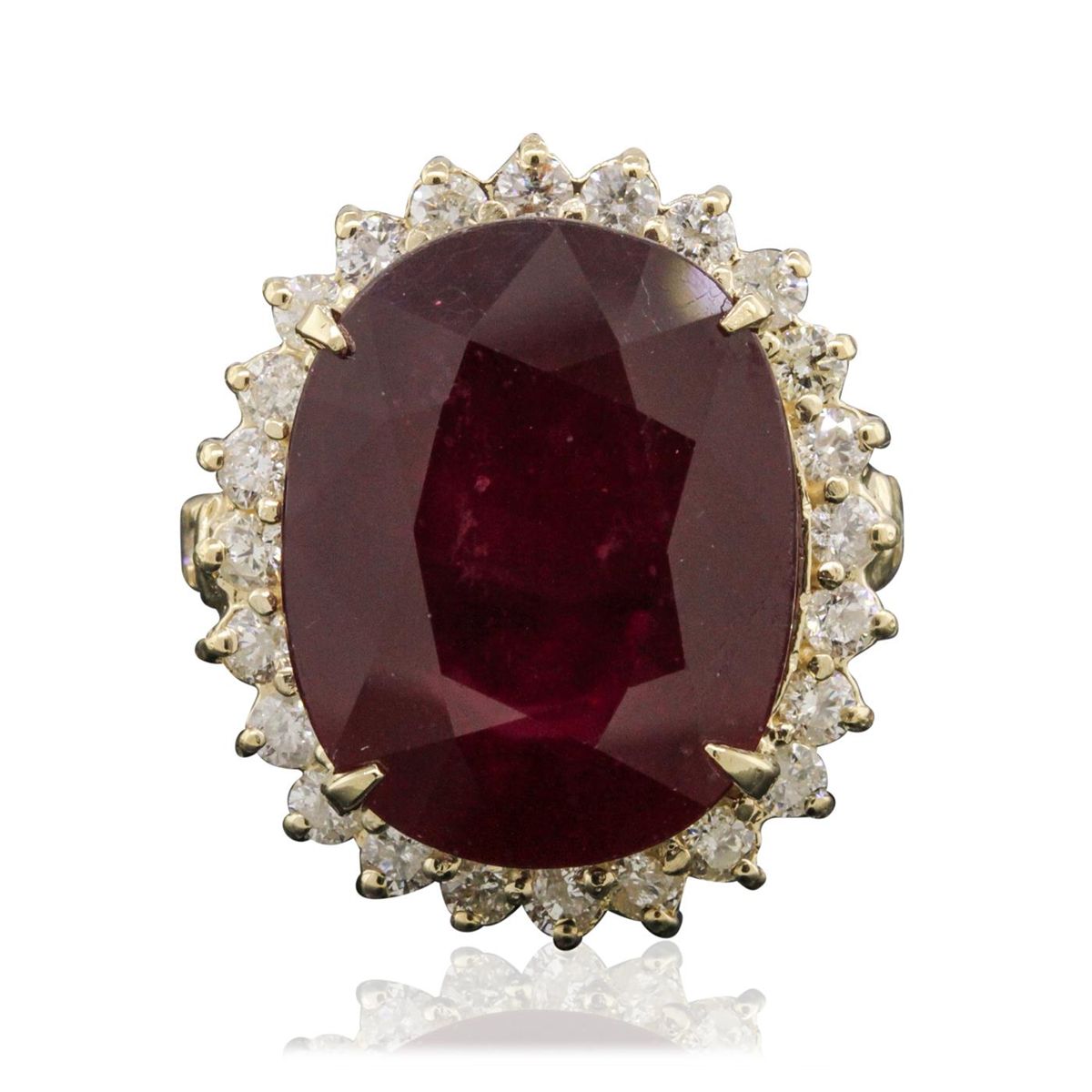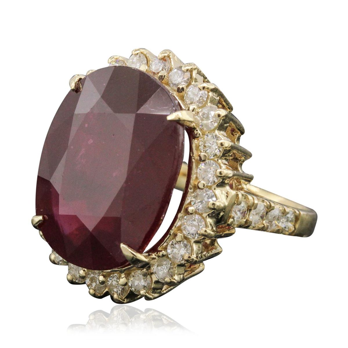 One electronically tested 14KT yellow gold ladies combination cast & assembled ring with a bright polish finish. Condition is new. Identified with markings of "K14". Containing: Thirty-Two prong set round brilliant cut diamonds, measuring 2.00 - 2.00 x 1.20mm (depth est.) approximate. Total Weight of 32 Stones = 0.93ct. Clarity: I-1 to I-2. Color: J - K, Cut is Good. One prong set oval modified brilliant cut natural ruby, measuring 18.00 x 14.00 x 9.10mm, approximate weight of 4.66ct., clarity is heavily included, medium dark, moderately strong, strongly purplish red color, (GIA stpR 6/4), cut is good. Colored gemstones are presumed to have been subjected to commonly used enhancement processes. All diamonds and colored gemstones are graded in the mounting, unless otherwise stated. Total Weight of Colored Stones 4.66ct. Total Weight of Diamonds 0.93ct. Total Weight of Ring 10.50 grams. GGL Appraised at $10,610.00.