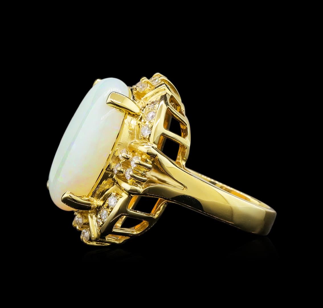 One electronically tested 14KT yellow gold ladies cast opal and diamond ring with a bright polish finish. Identified with markings of "14K". Condition is new. Containing: One white opal that is cut in a oval shape and is prong set, measuring 19.00mm long x 14.00mm wide, and 4.00mm thick and the approximate weight is 4.68 carats. The opal has a somewhat bright, green-blue play of color (fire) in a flashfire pattern; a low dome; a good cut; no inclusions; consistent in its brightness and pattern; and is somewhat directional. Twenty-Eight prong set round brilliant cut diamonds, measuring 1.50 - 1.50 x 0.90mm (depth est.) approximate total weight of 28 Stones = 0.51ct. Clarity: SI-1 to I-1. Color: J - K, Cut is Good. Colored gemstones are presumed to have been subjected to commonly used enhancement processes. All diamonds and colored gemstones are graded in the mounting, unless otherwise stated. Total Weight of Diamonds 0.51ct. Total Weight of Opals 4.68ct. Total Weight of Ring 10.70 grams. GGL Appraised at $3,430.00.