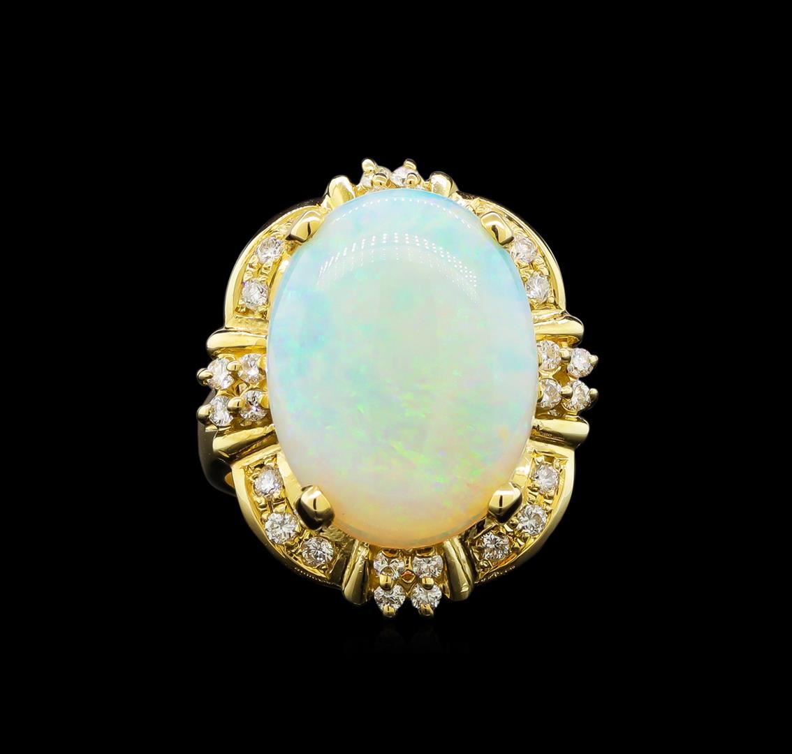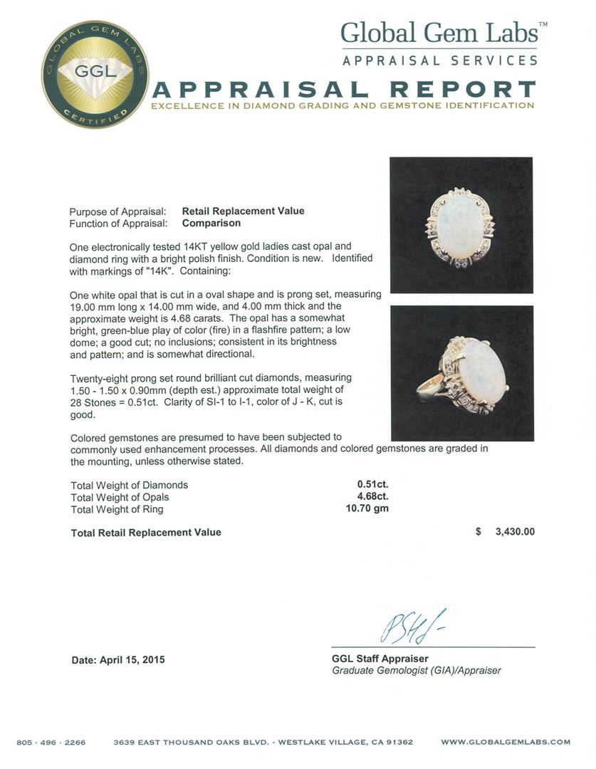 One electronically tested 14KT yellow gold ladies cast opal and diamond ring with a bright polish finish. Identified with markings of "14K". Condition is new. Containing: One white opal that is cut in a oval shape and is prong set, measuring 19.00mm long x 14.00mm wide, and 4.00mm thick and the approximate weight is 4.68 carats. The opal has a somewhat bright, green-blue play of color (fire) in a flashfire pattern; a low dome; a good cut; no inclusions; consistent in its brightness and pattern; and is somewhat directional. Twenty-Eight prong set round brilliant cut diamonds, measuring 1.50 - 1.50 x 0.90mm (depth est.) approximate total weight of 28 Stones = 0.51ct. Clarity: SI-1 to I-1. Color: J - K, Cut is Good. Colored gemstones are presumed to have been subjected to commonly used enhancement processes. All diamonds and colored gemstones are graded in the mounting, unless otherwise stated. Total Weight of Diamonds 0.51ct. Total Weight of Opals 4.68ct. Total Weight of Ring 10.70 grams.