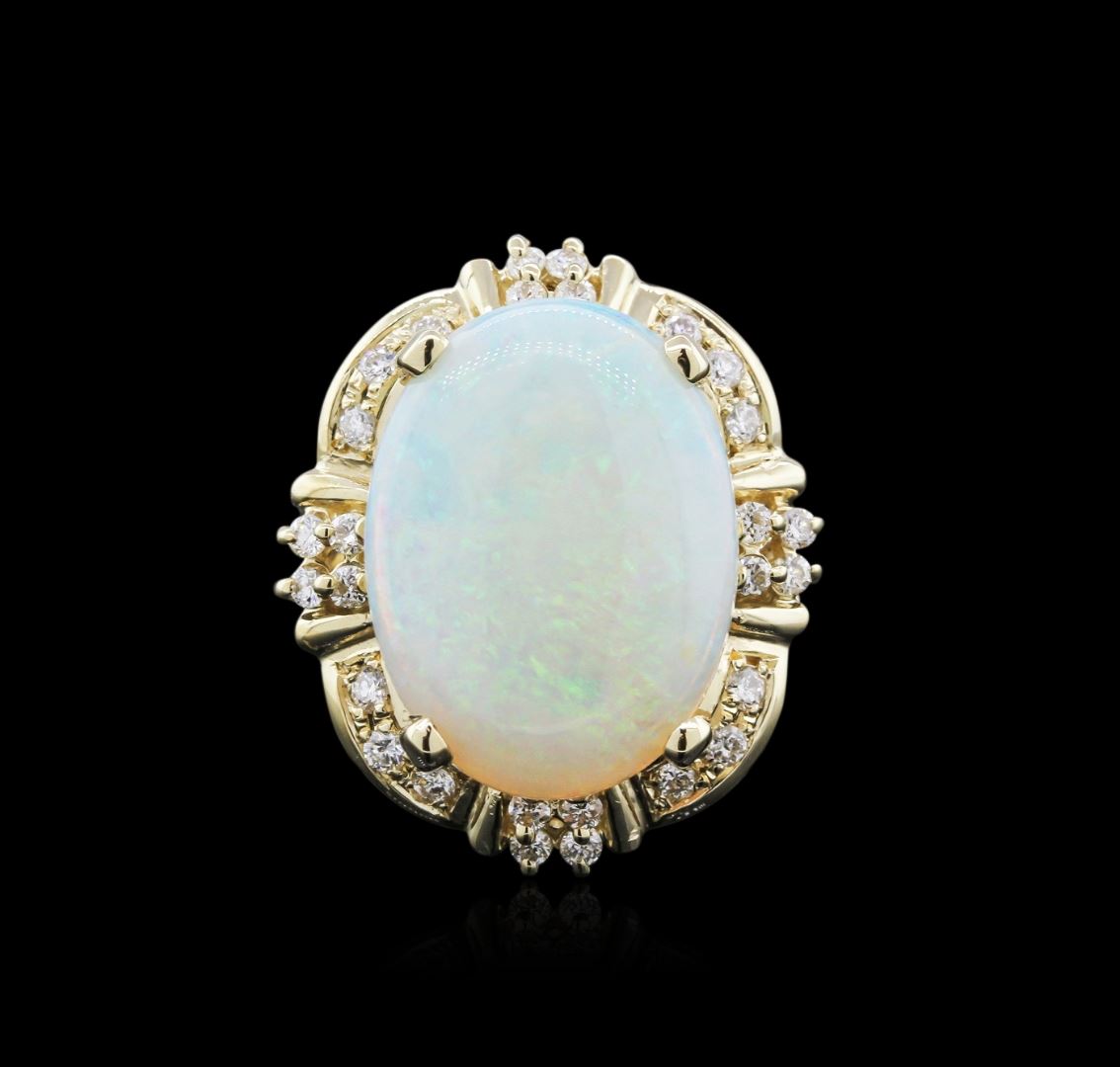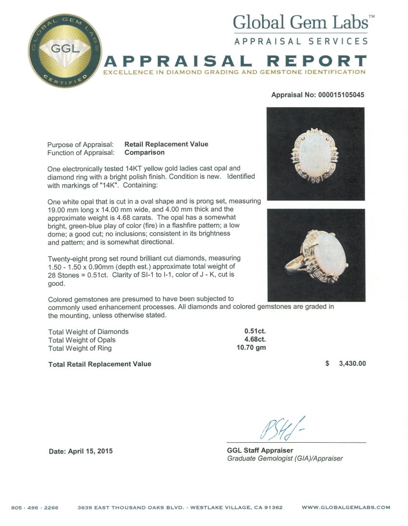 One electronically tested 14KT yellow gold ladies cast opal and diamond ring with a bright polish finish. Identified with markings of "14K". Condition is new. Containing: One white opal that is cut in a oval shape and is prong set, measuring 19.00mm long x 14.00mm wide, and 4.00mm thick and the approximate weight is 4.68 carats. The opal has a somewhat bright, green-blue play of color (fire) in a flashfire pattern; a low dome; a good cut; no inclusions; consistent in its brightness and pattern; and is somewhat directional. Twenty-Eight prong set round brilliant cut diamonds, measuring 1.50 - 1.50 x 0.90mm (depth est.) approximate total weight of 28 Stones = 0.51ct. Clarity: SI-1 to I-1. Color: J - K, Cut is Good. Colored gemstones are presumed to have been subjected to commonly used enhancement processes. All diamonds and colored gemstones are graded in the mounting, unless otherwise stated. Total Weight of Diamonds 0.51ct. Total Weight of Opals 4.68ct. Total Weight of Ring 10.70 grams. GGL Appraised at $3,430.00.