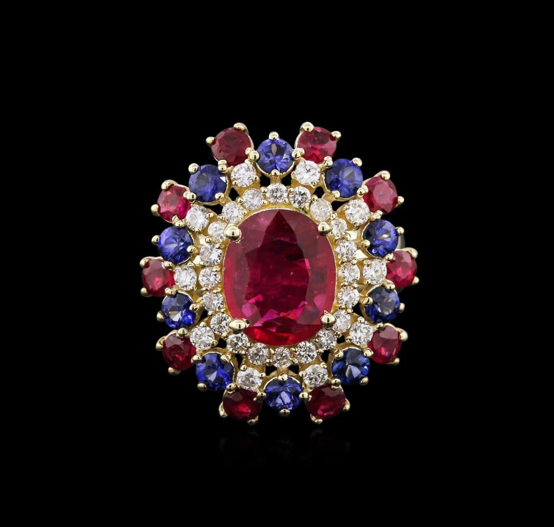 One electronically tested 14KT yellow gold ladies cast ruby, sapphire and diamond ring with a tapered shank with a bright polish finish. Identified with markings of "K14". Condition is new. Containing: One prong set oval modified brilliant cut natural ruby, measuring 10.72 x 8.80 x 5.72mm, exact weight 3.14ct., clarity is heavily included, type II, medium dark, very slightly brownish, strongly purplish red color, (GIA stpR 6/3), cut is good. Ten prong set round modified brilliant cut natural rubies, measuring 3.00 - 3.00 x 1.95 mm, exact total weight 1.54ct., clarity is heavily included, type II, medium dark, very slightly brownish, strongly purplish red color, (GIA stpR 6/3), cut is good. Ten prong set round modified brilliant cut natural blue sapphires, measuring 3.00 - 3.00 x 1.95 mm, exact total weight 1.32ct., clarity is slightly included, type II, medium, very slightly grayish, blue color, (GIA B 5/3), cut is good. Eighteen prong set round brilliant cut diamonds, measuring 1.80 - 1.80 x 1.08mm (depth est.) exact total weight 18 Stones = 1.32ct. Clarity: SI-2 to I-1. Color: H - I, Cut is Good. Twenty prong set round brilliant cut diamonds, measuring 1.50 - 1.50 x 0.90mm (depth est.) exact total weight 20 Stones = 0.43ct. Clarity: SI-1 to I-1. Color: I - J, Cut is Good. All diamonds and colored gemstones are graded in the mounting, unless otherwise stated. Colored gemstones are presumed to have been subjected to commonly used enhancement processes. Total Weight of Colored Stones 6.00ct. Total Weight of Diamonds 1.75ct. Total Weight of Ring 11.80 grams. GGL Appraised at $5,340.00.
