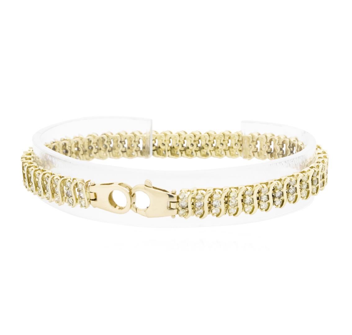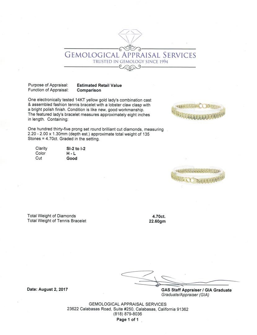 One electronically tested 14KT yellow gold lady's combination cast & assembled fashion tennis bracelet with a lobster claw clasp with a bright polish finish. The featured lady's bracelet measures approximately eight inches in length. Condition is like new, good workmanship. Containing: One Hundred Thirty-Five prong set round brilliant cut diamonds, measuring 2.20 - 2.00 x 1.30mm (depth est.) approximate total weight of 135 Stones = 4.70ct. Graded in the setting. Color H - L Clarity SI-2 to I-2 Cut Good. Total Weight of Diamonds 4.70ct.. Total Weight of Tennis Bracelet 22.60gm GAS Appraised.