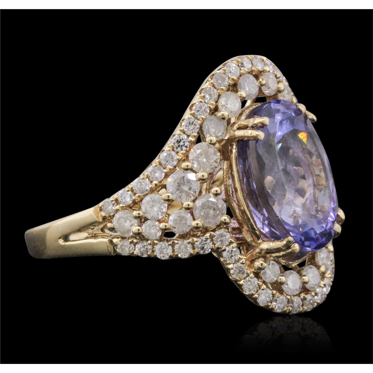 One electronically tested 14KT yellow gold ladies combination cast & assembled tanzanite and diamond ring with a flat shank with a bright polish finish. Identified with markings of "14K". Condition is new. Containing: One prong set oval modified brilliant cut natural tanzanite, measuring 11.31 x 8.60 x 7.13mm, approximate weight of 4.73ct., clarity is eye clean, type I, medium light, very slightly grayish, violet color, (GIA V 4/3), cut is good. Seventy-Two prong set round brilliant cut diamonds, measuring 2.10 - 1.30 x 1.02mm (depth est.) approximate total weight of 72 Stones = 1.29ct. Clarity: SI-1 to I-1. Color: I - J, Cut is Good. Colored gemstones are presumed to have been subjected to commonly used enhancement processes. All diamonds and colored gemstones are graded in the mounting, unless otherwise stated. Total Weight of Colored Stones 4.73ct. Total Weight of Diamonds 1.29ct. Total Weight of Ring 5.30 grams. GGL Appraised at $10,960.00.