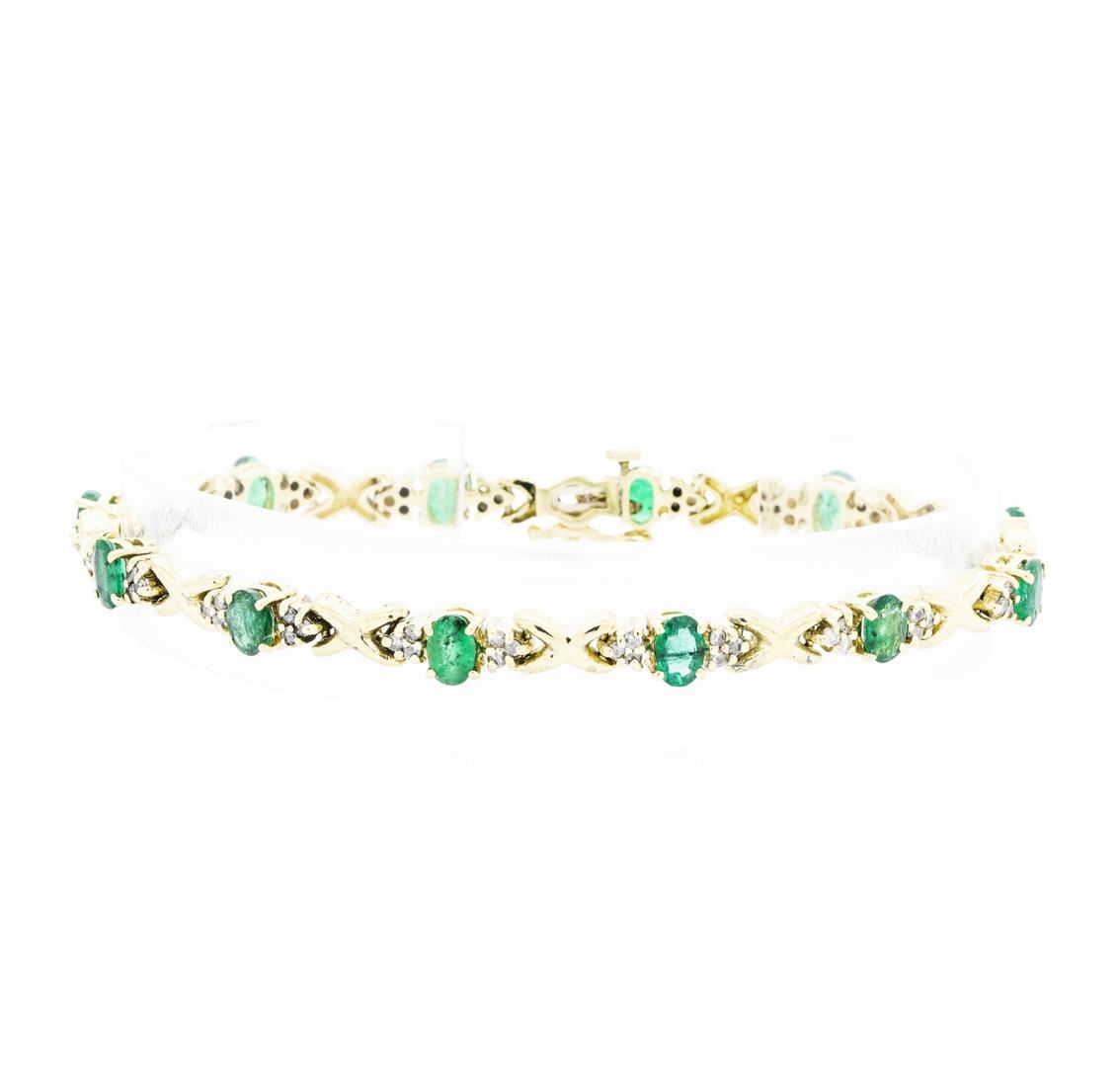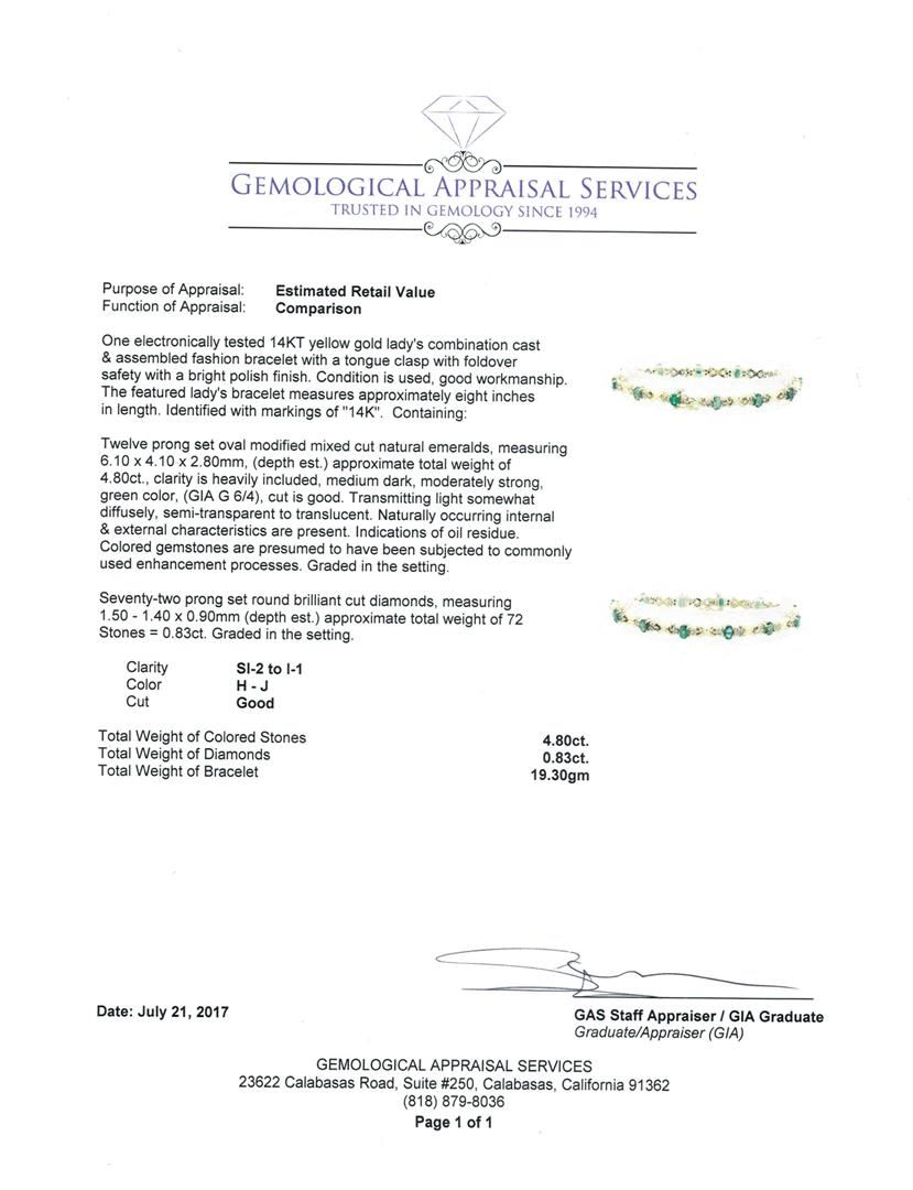 One electronically tested 14KT yellow gold Ladies combination cast & assembled fashion bracelet with a tongue clasp with foldover safety with a bright polish finish. The featured Ladies bracelet measures approximately eight inches in length. Identified with markings of '14K'. Condition is used, good workmanship. Containing: Twelve prong set oval modified mixed cut natural emeralds, measuring 6.10 x 4.10 x 2.80mm, (depth est.) approximate total weight of 4.80ct., clarity is heavily included, medium dark, moderately strong, green color, (GIA G 6/4), cut is good. Transmitting light somewhat diffusely, semi-transparent to translucent. Naturally occurring internal & external characteristics are present. Indications of oil residue. Colored gemstones are presumed to have been subjected to commonly used enhancement processes. Graded in the setting. Seventy-Two prong set round brilliant cut diamonds, measuring 1.50 - 1.40 x 0.90mm (depth est.) approximate total weight of 72 Stones = 0.83ct. Graded in the setting. Color H - J Clarity SI-2 to I-1 Cut Good. Total Weight of Colored Stones 4.80ct. Total Weight of Diamonds 0.83ct. Total Weight of Bracelet 19.30gm. GAS Appraised.