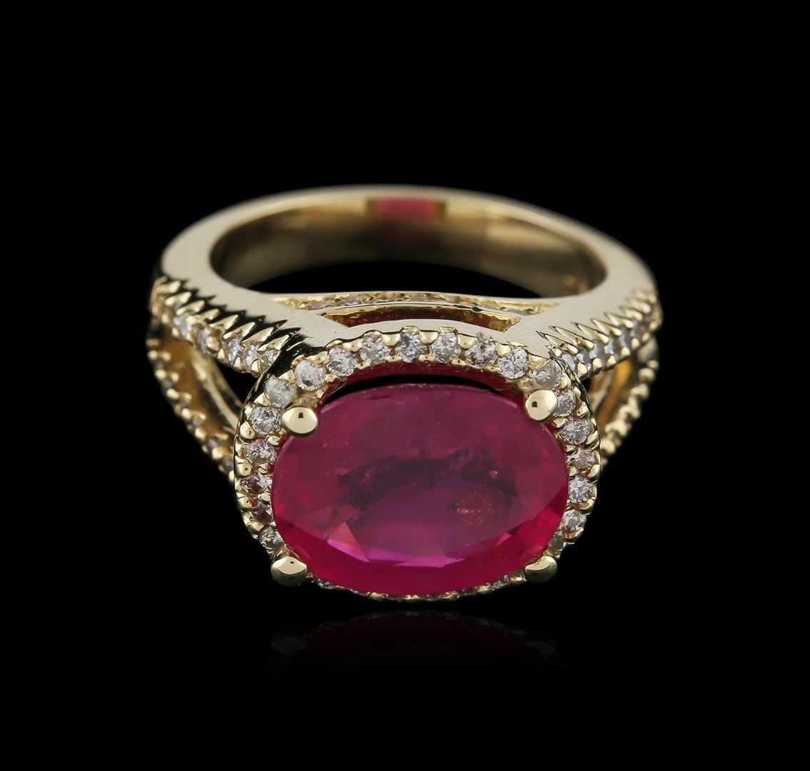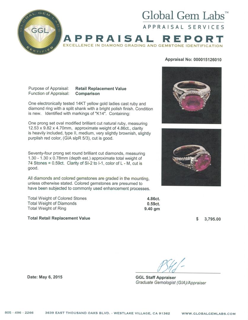 One electronically tested 14KT yellow gold ladies cast ruby and diamond ring with a split shank with a bright polish finish. Identified with markings of "K14". Condition is new. Containing: One prong set oval modified brilliant cut natural ruby, measuring 12.53 x 9.82 x 4.70mm, approximate weight of 4.86ct., clarity is heavily included, type II, medium, very slightly brownish, slightly purplish red color, (GIA slpR 5/3), cut is good. Seventy-Four prong set round brilliant cut diamonds, measuring 1.30 - 1.30 x 0.78mm (depth est.) approximate total weight of 74 Stones = 0.59ct. Clarity: SI-2 to I-1. Color: L - M, Cut is Good. All diamonds and colored gemstones are graded in the mounting, unless otherwise stated. Colored gemstones are presumed to have been subjected to commonly used enhancement processes.. Total Weight of Colored Stones 4.86ct. Total Weight of Diamonds 0.59ct. Total Weight of Ring 9.40 grams. GGL Appraised at $3,795.00.