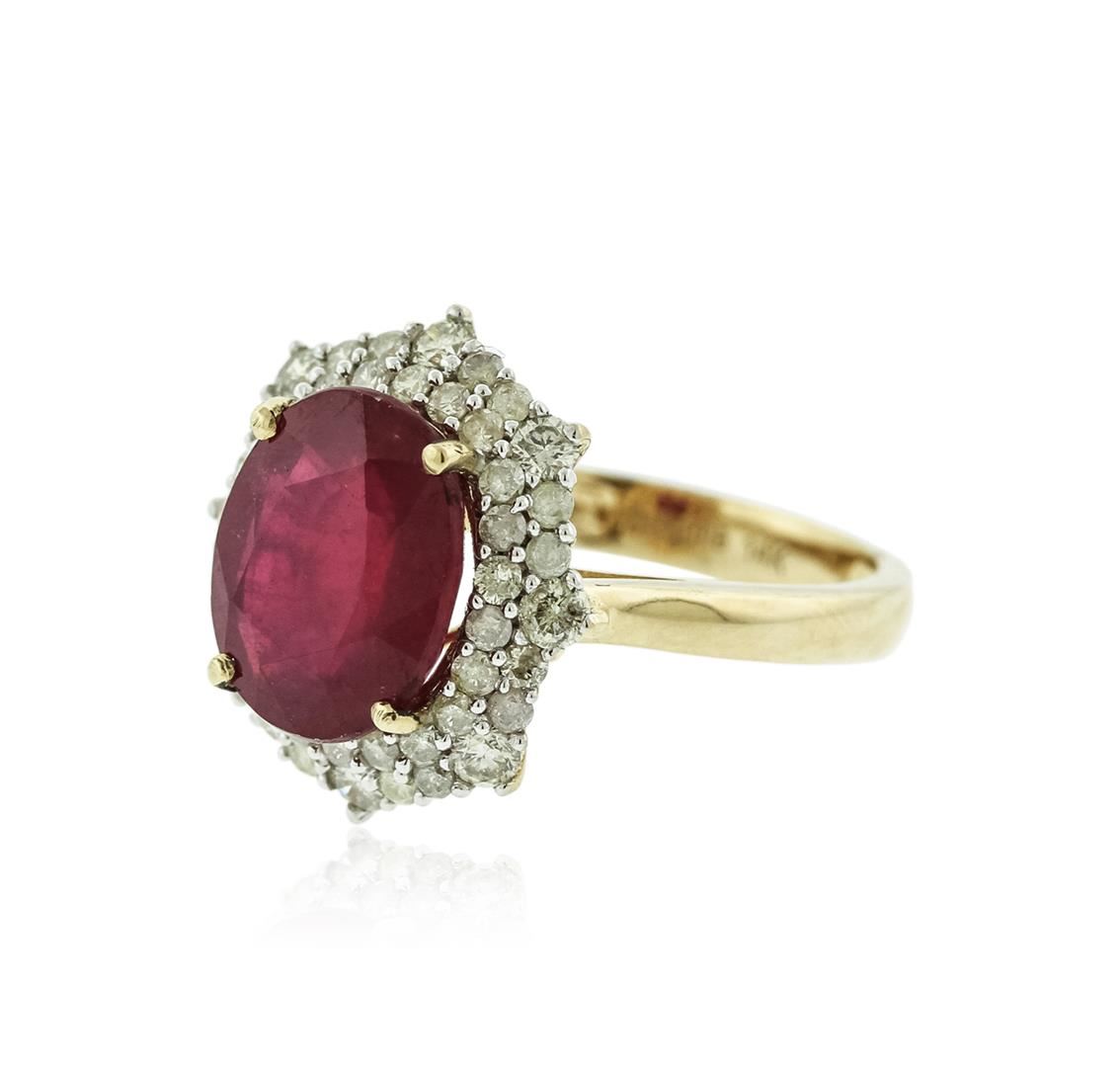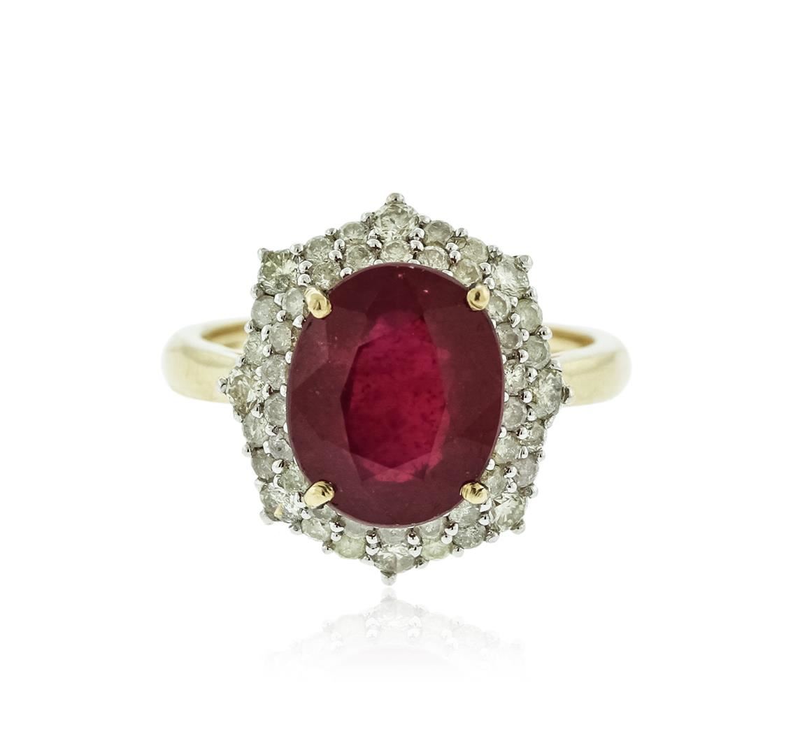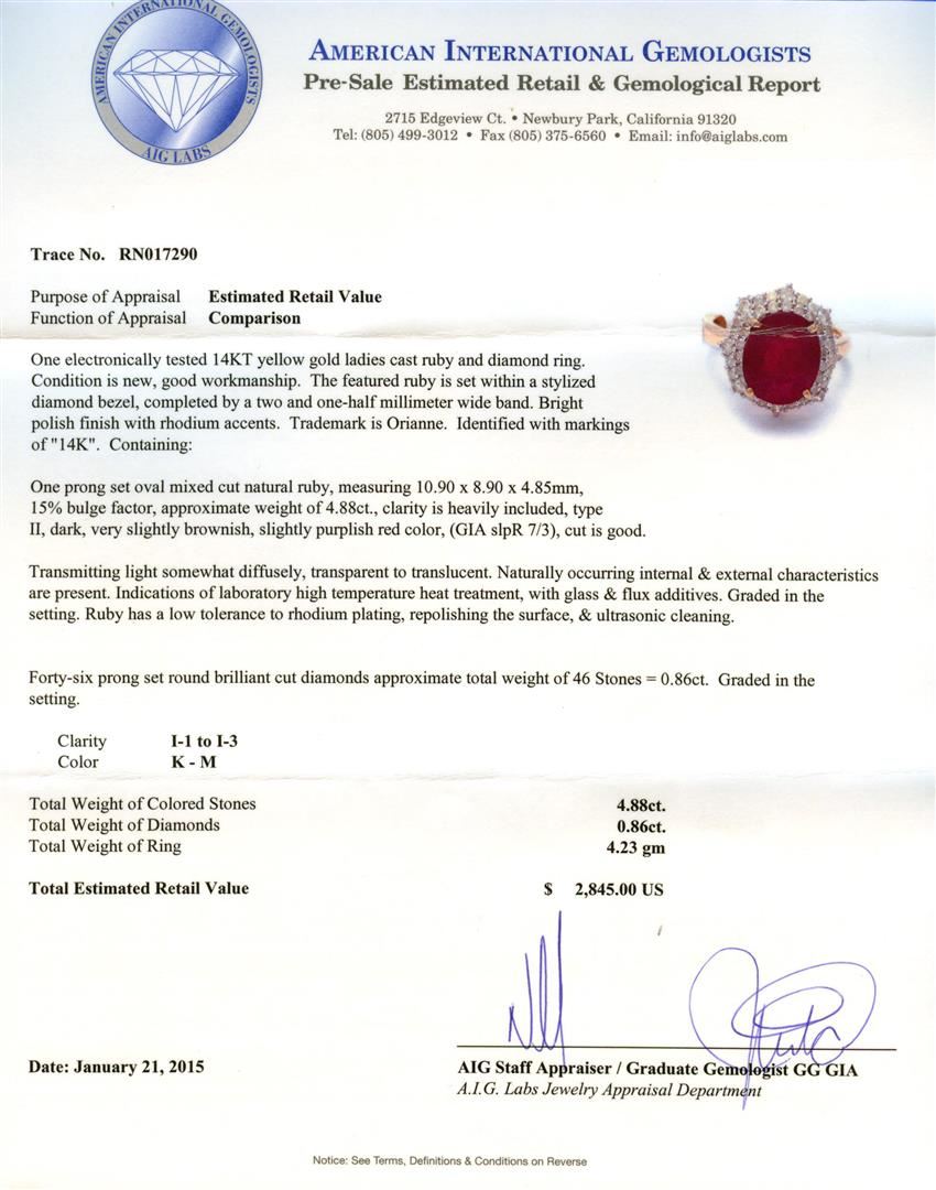 One electronically tested 14KT yellow gold ladies cast ruby and diamond ring. The featured ruby is set within a stylized diamond bezel, completed by a two and one-half millimeter wide band. Bright polish finish with rhodium accents. Trademark is Orianne. Identified with markings of "14K". Condition is new, good workmanship. Containing: One prong set oval mixed cut natural ruby, measuring 10.90 x 8.90 x 4.85mm, 15%. bulge factor, approximate weight of 4.88ct., clarity is heavily included, type II, dark, very slightly brownish, slightly purplish red color, (GIA slpR 7/3), cut is good. Transmitting light somewhat diffusely, transparent to translucent. Naturally occurring internal & external characteristics are present. Indications of laboratory high temperature heat treatment, with glass & flux additives. Graded in the setting. Ruby has a low tolerance to rhodium plating, repolishing the surface, & ultrasonic cleaning. Forty-Six prong set round brilliant cut diamonds approximate total weight of 46 Stones = 0.86ct. Graded in the setting. Clarity: I-1 to I-3. Color: K - M. Total Weight of Colored Stones 4.88ct. Total Weight of Diamonds 0.86ct. Total Weight of Ring 4.23gm. AIG Appraised at $2,845.00.