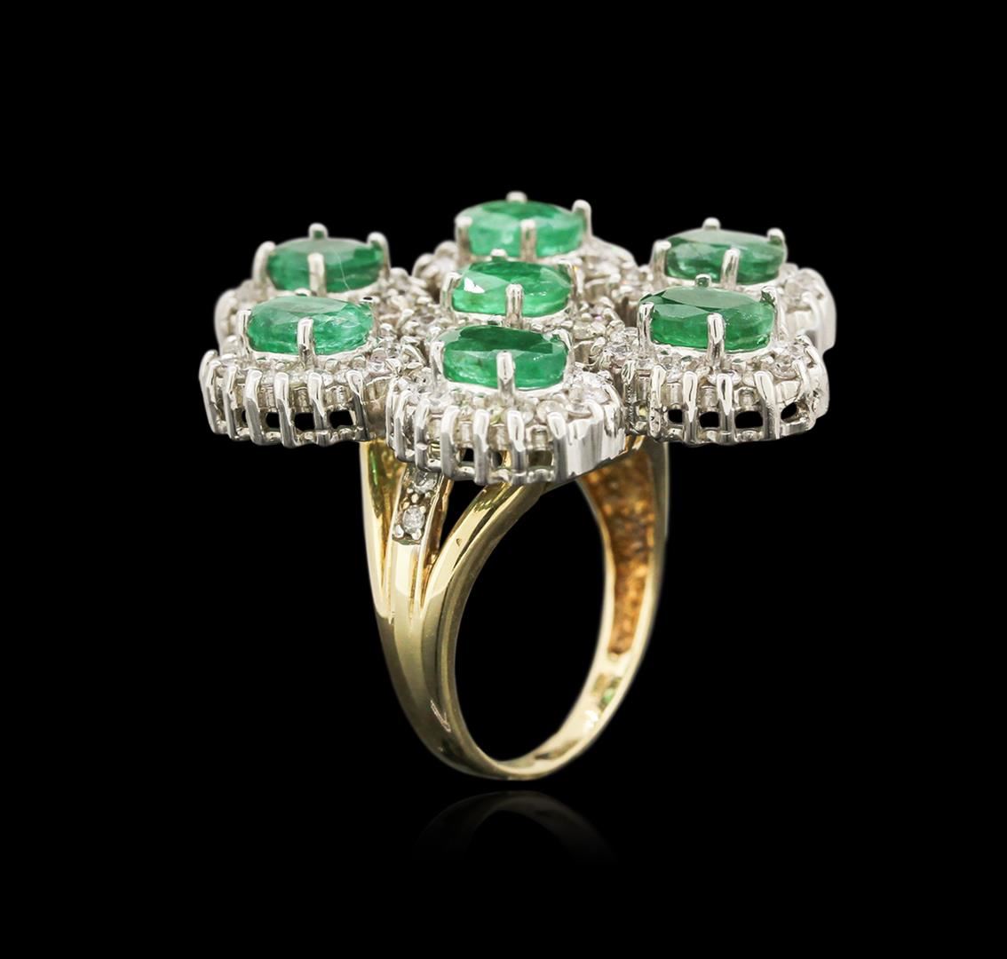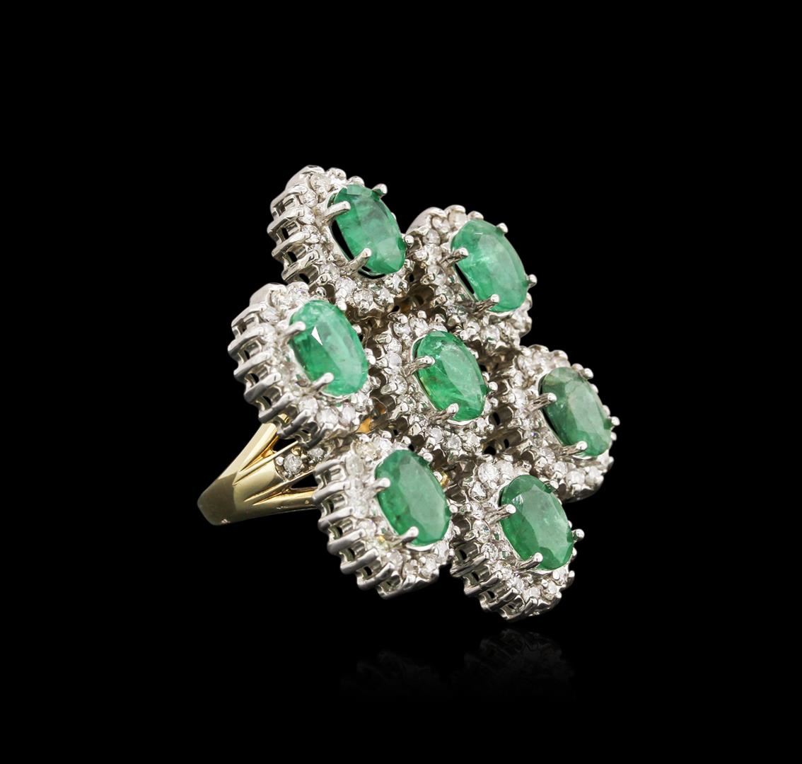 One electronically tested 14KT yellow gold ladies cast emerald and diamond ring with a bright polish finish. Identified with markings of "14K". Condition is very good. Containing: Seven prong set oval modified brilliant cut natural emeralds, measuring 7.00 x 5.20 x 3.38mm, approximate total weight of 4.90ct., clarity is heavily included, type III, medium, very slightly grayish, green color, (GIA G 5/3)One Hundred Twelve prong set round brilliant cut diamonds, measuring 1.50 - 1.50 x 0.90mm (depth est.) approximate total weight of 112 Stones = 1.38ct. Clarity: I-1 to I-2. Color: I - J. Colored gemstones are presumed to have been subjected to commonly used enhancement processes. All diamonds and colored gemstones are graded in the mounting, unless otherwise stated. Total Weight of Colored Stones 4.90ct. Total Weight of Diamonds 1.38ct. Total Weight of Ring 14.30 grams. GGL Appraised at $4,665.00.