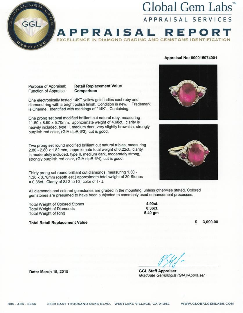 One electronically tested 14KT yellow gold ladies cast ruby and diamond ring with a bright polish finish. Trademark is Orianne. Identified with markings of "14K". Condition is new. Containing: One prong set oval modified brilliant cut natural ruby, measuring 11.50 x 8.50 x 5.70mm, approximate weight of 4.68ct., clarity is heavily included, type II, medium dark, very slightly brownish, strongly purplish red color, (GIA stpR 6/3), cut is good. Two prong set round modified brilliant cut natural rubies, measuring 2.80 - 2.80 x 1.82 mm, approximate total weight of 0.22ct., clarity is moderately included, type II, medium dark, moderately strong, strongly purplish red color, (GIA stpR 6/4), cut is good. Thirty prong set round brilliant cut diamonds, measuring 1.30 - 1.30 x 0.78mm (depth est.) approximate total weight of 30 Stones = 0.36ct. Clarity of SI-2 to I-2, Color of I - J. All diamonds and colored gemstones are graded in the mounting, unless otherwise stated. Colored gemstones are presumed to have been subjected to commonly used enhancement processes. Total Weight of Colored Stones 4.90ct. Total Weight of Diamonds 0.36ct. Total Weight of Ring 5.40 grams. GGL Appraised at $3,090.00.