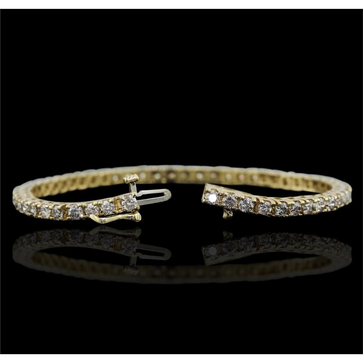 One electronically tested 14KT yellow gold Ladies combination cast & assembled tennis bracelet with a hidden box clasp with a bright polish finish. Condition is new. Measurements: 7" in length. Identified with markings of "14K". Containing: Fifty-Five prong set round brilliant cut diamonds, measuring 2.90 - 2.90 x 1.74mm (depth est.) approximate. Total Weight of 55 Stones = 4.91ct. Clarity: I-2 to I-3. Color: H - I, Cut is Good. Total Weight of Diamonds 4.91ct. Total Weight of Bracelet 12.50 grams. GGL Appraised at $11,230.00.