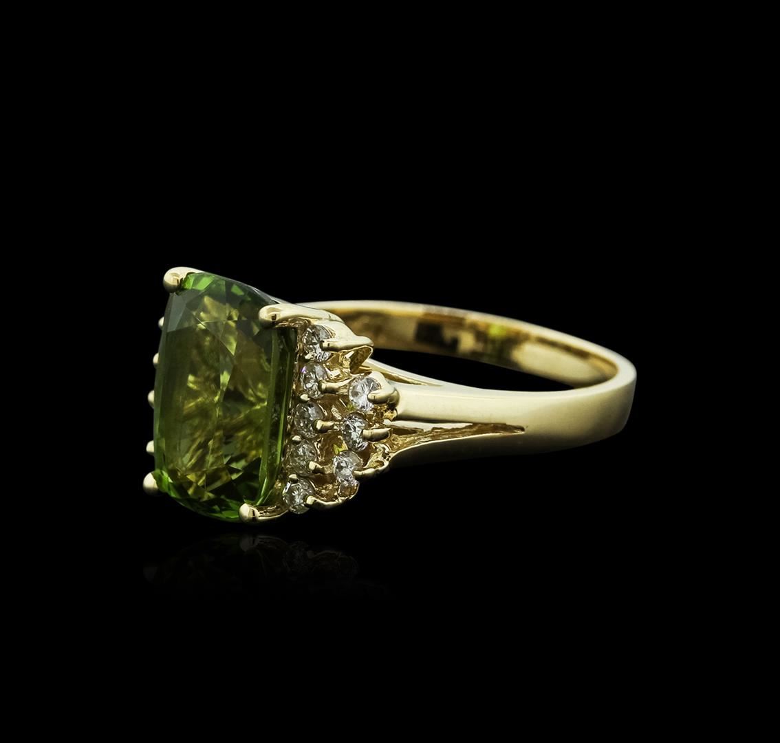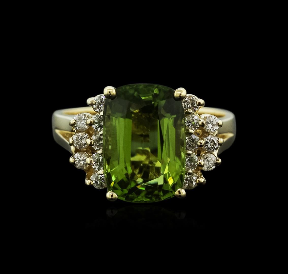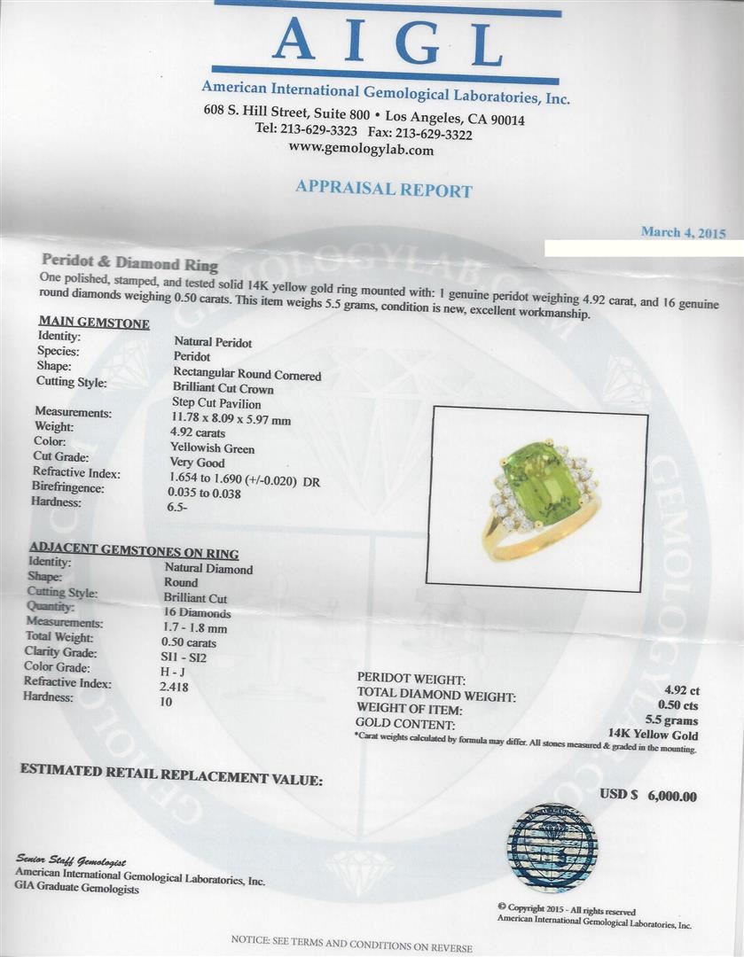 One polished, stamped, and tested solid 14K yellow gold ring mounted with: 1 genuine peridot weighing 4.92 carat, and 16 genuine round diamonds weighing 0.50 carats. This item weighs 5.5 grams, condition is new, excellent workmanship. MAIN GEMSTONE: Identity: Natural Peridot. Species: Peridot. Shape: Rectangular Round Cornered. Cutting Style: Brilliant Cut Crown Step Cut Pavilion. Measurements: 11.78 x 8.09 x 5.97 mm. Weight: 4.92 carats. Color: Yellowish Green. Cut Grade: Very Good. Refractive Index: 1.654 - 1.690 (+/-0.020) DR. Birefringence: 0.035 to 0.038. Hardness: 6.5-. ADJACENT GEMSTONES ON RING: Identity: Natural Diamond. Shape: Round. Cutting Style: Brilliant Cut. Quantity: 16 Diamonds. Measurements: 1.7 - 1.8 mm. Total Weight: 0.50 carats. Clarity Grade: SI1 - SI2. Color Grade: H -J. Refractive Index: 2.418. Hardness: 10. Peridot Weight: 4.92 ct. Total Diamond Weight: 0.50 cts. Weight of Item: 5.5 grams. Gold Content: 14K Yellow Gold. AIGL Appraised at $6,000.00.
