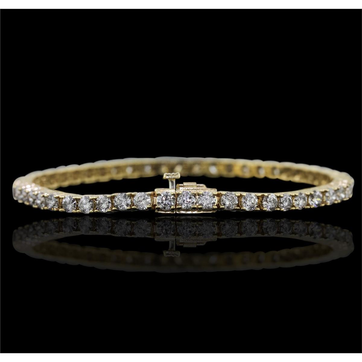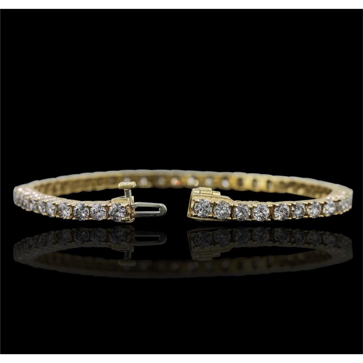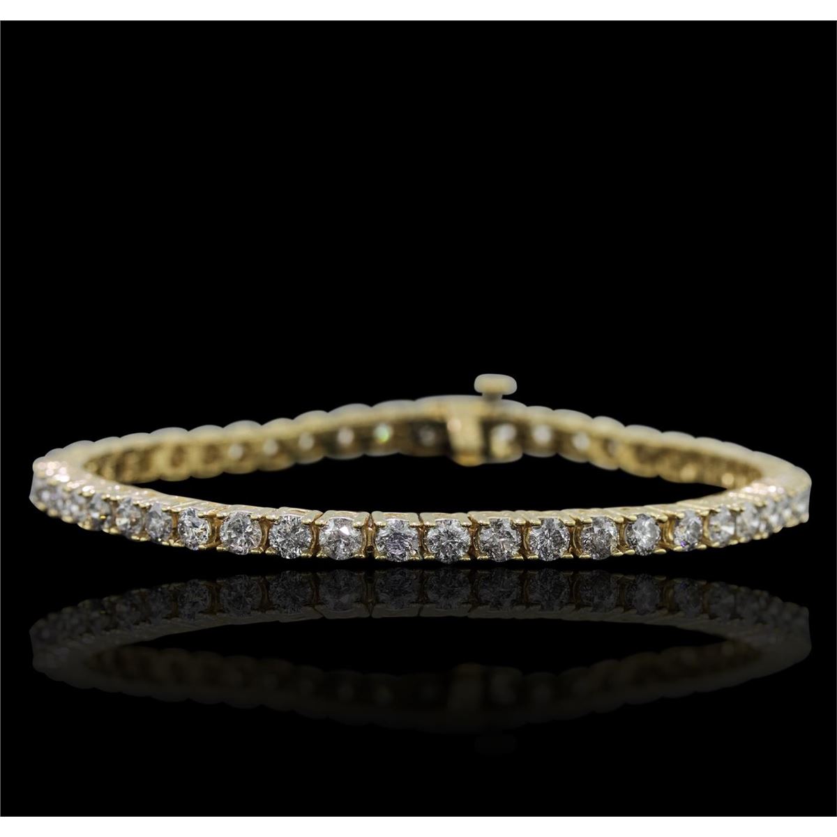 One electronically tested 14KT yellow gold Ladies combination cast & assembled tennis bracelet with a hidden box clasp with a bright polish finish. Condition is new. Measurements: 7" in length. Identified with markings of "14K". Containing: Fifty prong set round brilliant cut diamonds, measuring 3.00 - 3.00 x 1.80mm (depth est.) approximate. Total Weight of 50 Stones = 4.94ct. Clarity: I-1 to I-3. Color: I - J, Cut is Good. Total Weight of Diamonds 4.94ct. Total Weight of Bracelet 13.70 grams. GGL Appraised at $12,475.00.