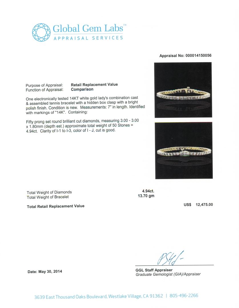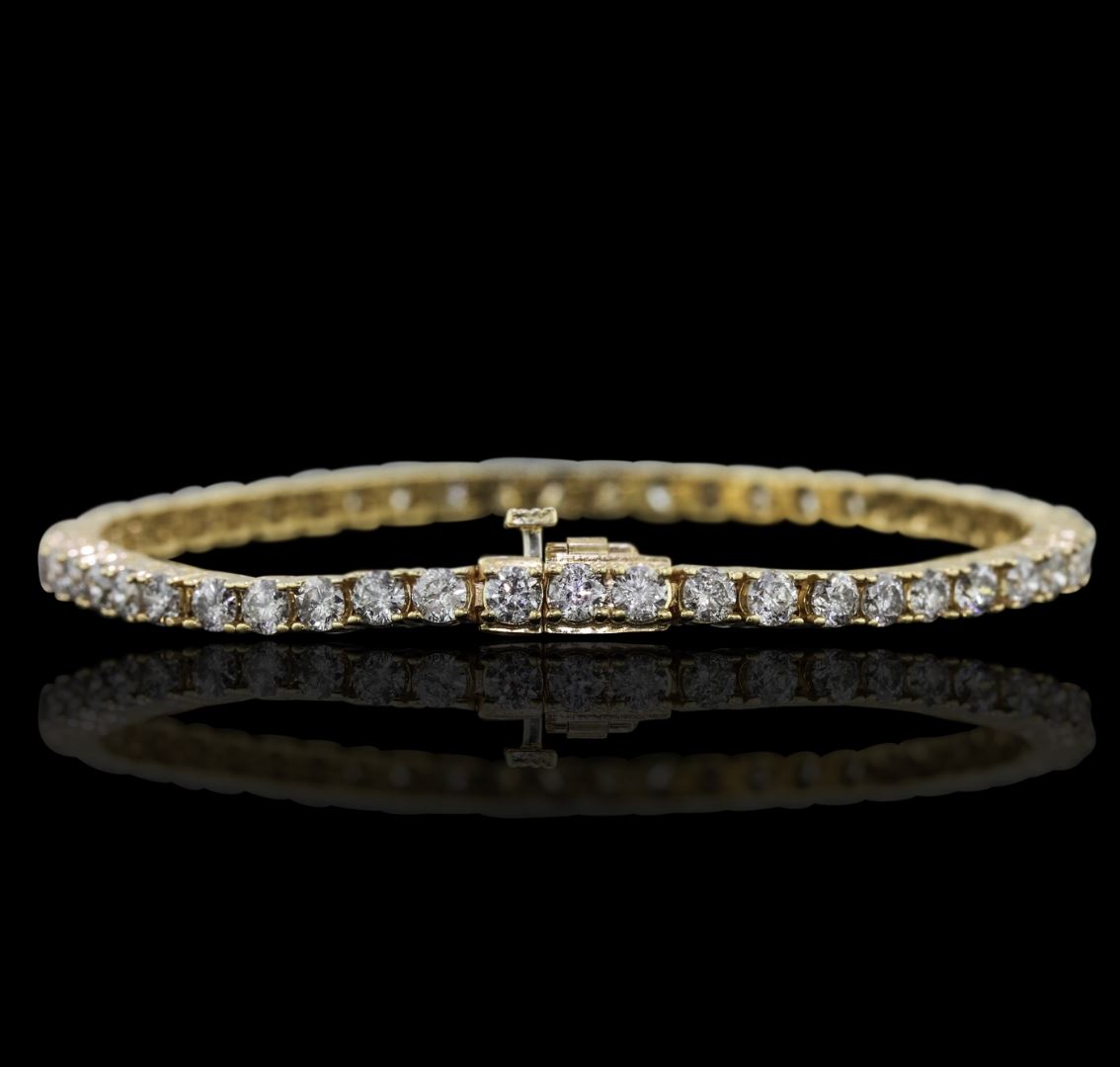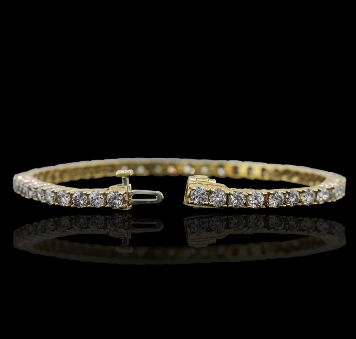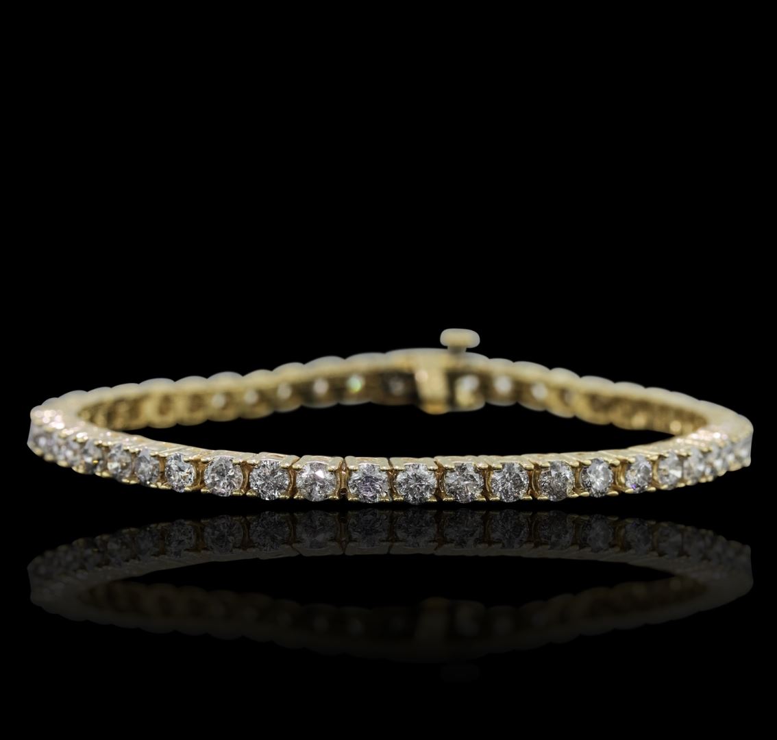 One electronically tested 14KT yellow gold Ladies combination cast & assembled tennis bracelet with a hidden box clasp with a bright polish finish. Condition is new. Measurements: 7" in length. Identified with markings of "14K". Containing: Fifty prong set round brilliant cut diamonds, measuring 3.00 - 3.00 x 1.80mm (depth est.) approximate. Total Weight of 50 Stones = 4.94ct. Clarity: I-1 to I-3. Color: I - J, Cut is Good. Total Weight of Diamonds 4.94ct. Total Weight of Bracelet 13.70 grams. GGL Appraised at $12,475.00.