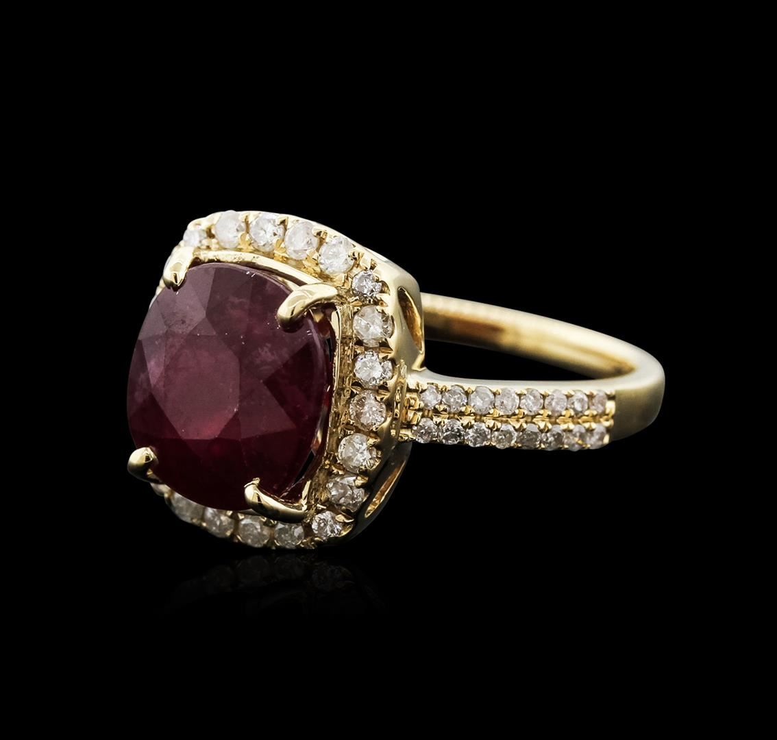 One electronically tested 14KT yellow gold ladies cast ruby and diamond ring with a flat shank with a bright polish finish. Trademark is Orianne. Identified with markings of "14K". Condition is new. Containing: One prong set rectangular cushion modified brilliant cut natural ruby, measuring 9.86 x 9.06 x 5.89mm, approximate weight of 4.95ct., clarity is heavily included, type II, medium dark, very slightly brownish, strongly purplish red color, (GIA stpR 6/3), cut is good. Fifty-Four prong set round brilliant cut diamonds, measuring 1.60 - 1.10 x 0.81mm (depth est.) approximate total weight of 54 Stones = 0.40ct. Clarity: I-2 to I-3. Color: J - K. All diamonds and colored gemstones are graded in the mounting, unless otherwise stated. Colored gemstones are presumed to have been subjected to commonly used enhancement processes. Total Weight of Colored Stones 4.95ct. Total Weight of Diamonds 0.40ct. Total Weight of Ring 5.20 grams. GGL Appraised at $2,825.00.