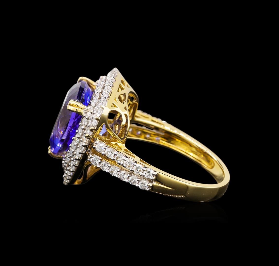 One electronically tested 14KT yellow gold ladies cast tanzanite and diamond ring with a split shoulder shank with a bright polish finish. Trademark is Orianne. Identified with markings of "14K". Condition is new. Containing: One prong set triangle modified brilliant cut natural tanzanite, measuring 10.71 x 10.43 x 7.37mm, approximate weight of 4.96ct., clarity is eye clean, type I, medium light, moderately strong, violetish blue color, (GIA vB 4/4), cut is good. Eighty-Seven prong set round brilliant cut diamonds, measuring 1.20 - 1.20 x 0.72mm (depth est.) approximate total weight of 87 Stones = 0.55ct. Clarity: SI-2 to I-2. Color: I - J, Cut is Good. All diamonds and colored gemstones are graded in the mounting, unless otherwise stated. Colored gemstones are presumed to have been subjected to commonly used enhancement processes.. Total Weight of Colored Stones 4.96ct. Total Weight of Diamonds 0.55ct. Total Weight of Ring 6.20 grams. GGL Appraised at $6,645.00.