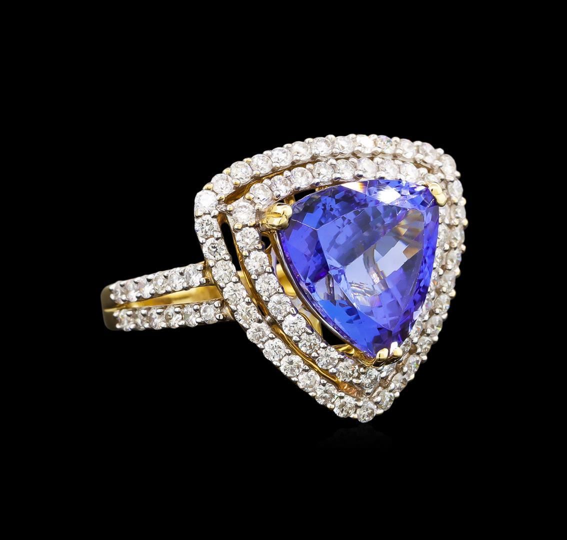 One electronically tested 14KT yellow gold ladies cast tanzanite and diamond ring with a split shoulder shank with a bright polish finish. Trademark is Orianne. Identified with markings of "14K". Condition is new. Containing: One prong set triangle modified brilliant cut natural tanzanite, measuring 10.71 x 10.43 x 7.37mm, approximate weight of 4.96ct., clarity is eye clean, type I, medium light, moderately strong, violetish blue color, (GIA vB 4/4), cut is good. Eighty-Seven prong set round brilliant cut diamonds, measuring 1.20 - 1.20 x 0.72mm (depth est.) approximate total weight of 87 Stones = 0.55ct. Clarity: SI-2 to I-2. Color: I - J, Cut is Good. All diamonds and colored gemstones are graded in the mounting, unless otherwise stated. Colored gemstones are presumed to have been subjected to commonly used enhancement processes.. Total Weight of Colored Stones 4.96ct. Total Weight of Diamonds 0.55ct. Total Weight of Ring 6.20 grams. GGL Appraised.
