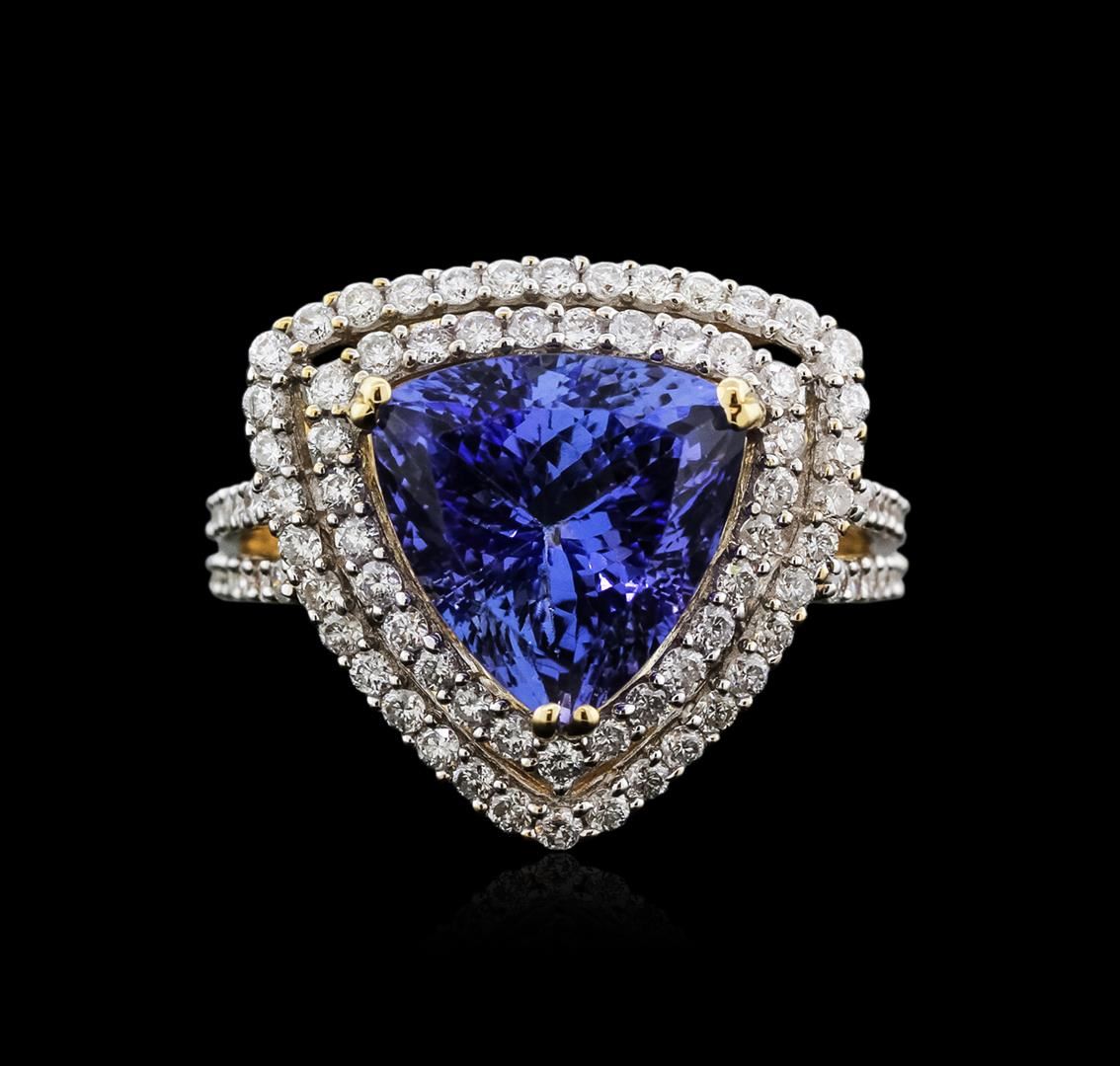 One electronically tested 14KT yellow gold ladies cast tanzanite and diamond ring with a split shoulder shank with a bright polish finish. Trademark is Orianne. Identified with markings of "14K". Condition is new. Containing: One prong set triangle modified brilliant cut natural tanzanite, measuring 10.71 x 10.43 x 7.37mm, approximate weight of 4.96ct., clarity is eye clean, type I, medium light, moderately strong, violetish blue color, (GIA vB 4/4), cut is good. Eighty-Seven prong set round brilliant cut diamonds, measuring 1.20 - 1.20 x 0.72mm (depth est.) approximate total weight of 87 Stones = 0.55ct. Clarity: SI-2 to I-2. Color: I - J, Cut is Good. All diamonds and colored gemstones are graded in the mounting, unless otherwise stated. Colored gemstones are presumed to have been subjected to commonly used enhancement processes.. Total Weight of Colored Stones 4.96ct. Total Weight of Diamonds 0.55ct. Total Weight of Ring 6.20 grams. GGL Appraised at $6,645.00.