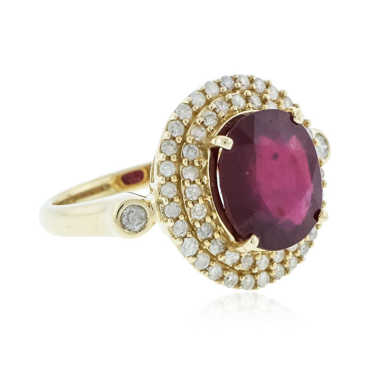 One electronically tested 14KT yellow gold ladies cast ruby and diamond ring with a bright polish finish. The featured ruby is set within a diamond bezel, supported by diamond accented shoulders, and completed by a two millimeter wide band. Trademark is Orianne. Identified with markings of "14K". Condition is new, good workmanship. Containing: One prong set oval mixed cut natural ruby, measuring 11.00. x 9.50 x 4.80mm, 8%. bulge factor, approximate weight of 4.98ct., clarity is eye clean, type II, medium dark, moderately strong, slightly purplish red color, (GIA slpR 6/4), cut is good. Transmitting light somewhat diffusely, transparent to translucent. Naturally occurring internal & external characteristics are present. Indications of laboratory high temperature heat treatment, with glass & flux additives. Graded in the setting. Ruby has a low tolerance to rhodium plating, repolishing the surface, & ultrasonic cleaning.Fifty-Six prong set round brilliant cut diamonds, measuring 2.20 - 1.30 x 1.05mm (depth est.) approximate. Total Weight of 56 Stones = 0.60ct. Graded in the setting. Clarity: I-2 to I-3 . Color: G - I. Total Weight of Colored Stones 4.98ct. Total Weight of Diamonds 0.60ct. Total Weight of Ring 6.30gm. AIG Appraised at $3,645.00.