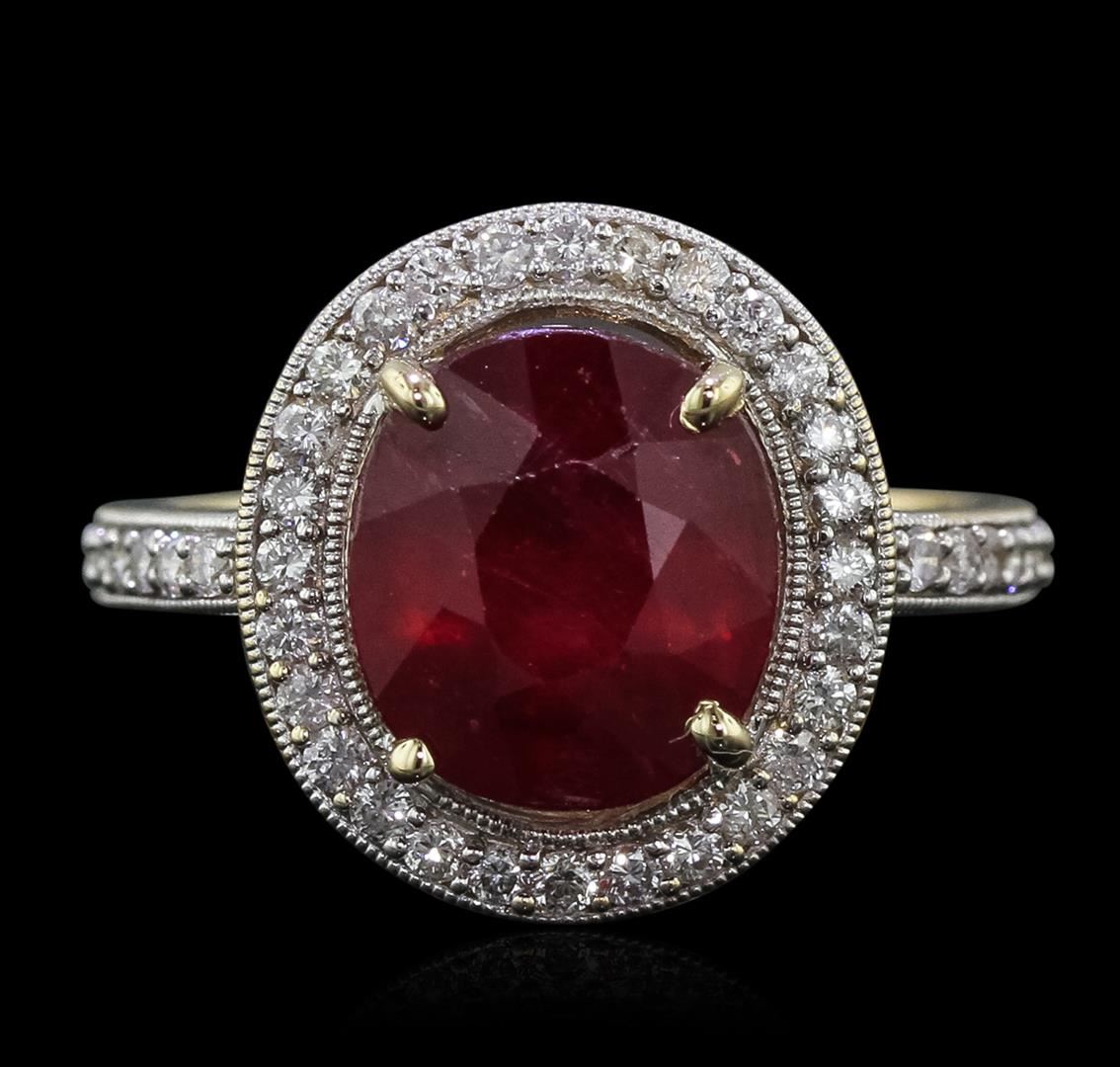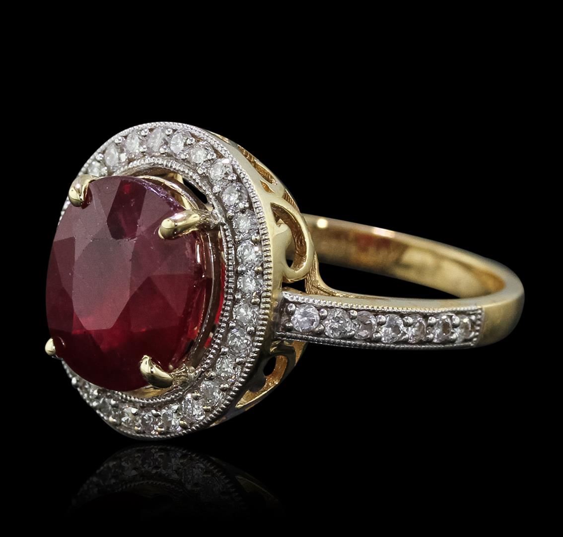 One electronically tested 14KT yellow gold ladies cast ruby and diamond ring. Condition is new, good workmanship. The featured ruby is set within a diamond bezel supported by diamond set shoulders, completed by a two millimeter wide band. Bright polish finish with rhodium accents and milgrain detailing. Trademark is Orianne. Identified with markings of "14K". Containing: One prong set oval mixed cut natural ruby, measuring 10.10 x 9.00 x 6.20mm, 10%. bulge factor, approximate weight of 4.98ct., clarity is heavily included, type II, medium dark, very slightly brownish, slightly purplish red color, (GIA slpR 6/3), cut is good. Transmitting light somewhat diffusely, transparent to translucent. Naturally occurring internal & external characteristics are present. Indications of laboratory high temperature heat treatment, with glass & flux additives. Graded in the setting. Ruby has a low tolerance to rhodium plating, repolishing the surface, & ultrasonic cleaning. Forty-Two prong set round brilliant cut diamonds, measuring 1.50 - 1.40 x 0.87mm (depth est.) approximate. Total Weight of 42 Stones = 0.56ct. Graded in the setting. Clarity: SI-1 to I-1 . Color: G - I. Total Weight of Colored Stones 4.98ct.. Total Weight of Diamonds 0.56ct.. Total Weight of Ring 4.92gm. AIG Appraised at $3,870.00.