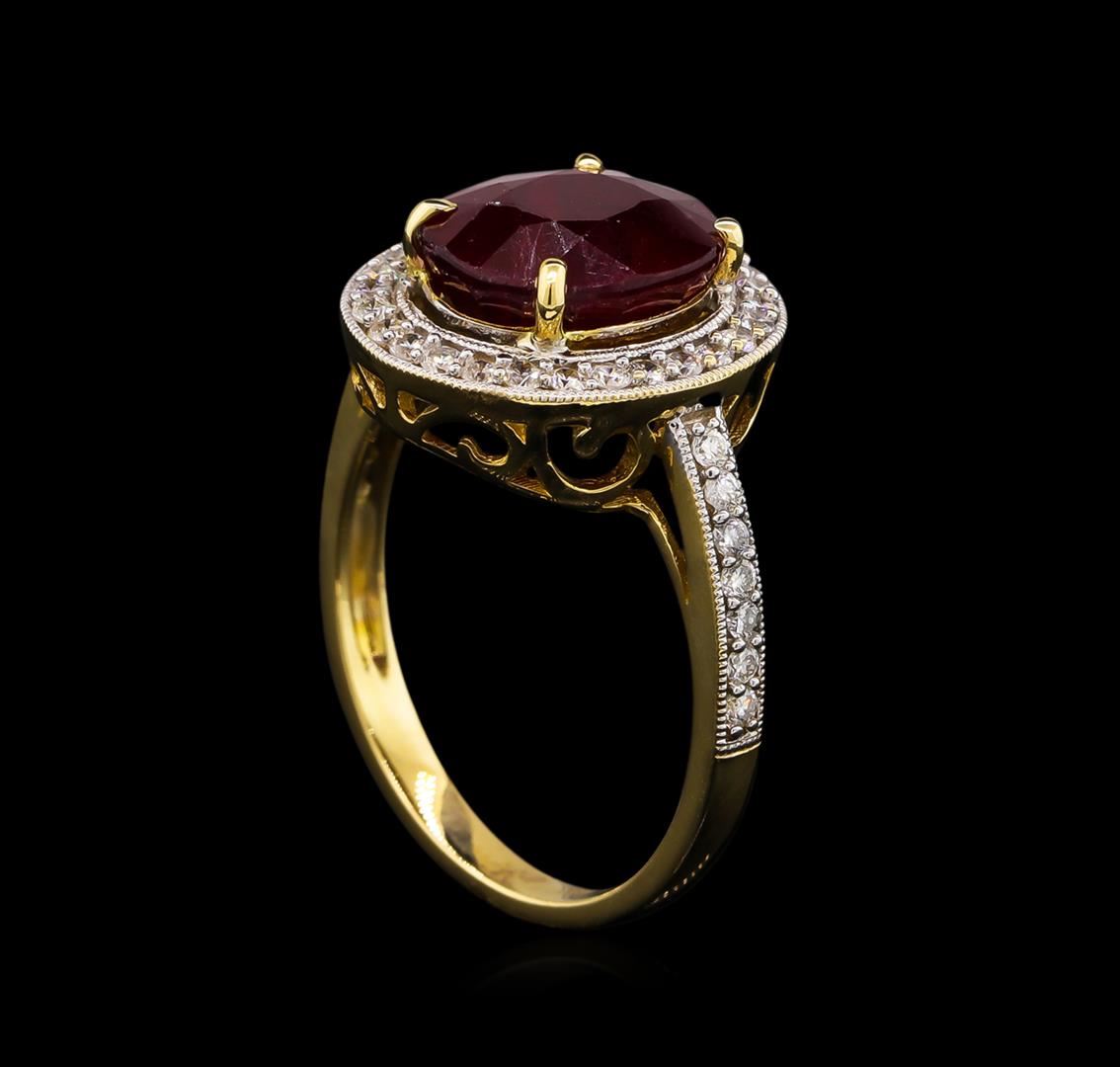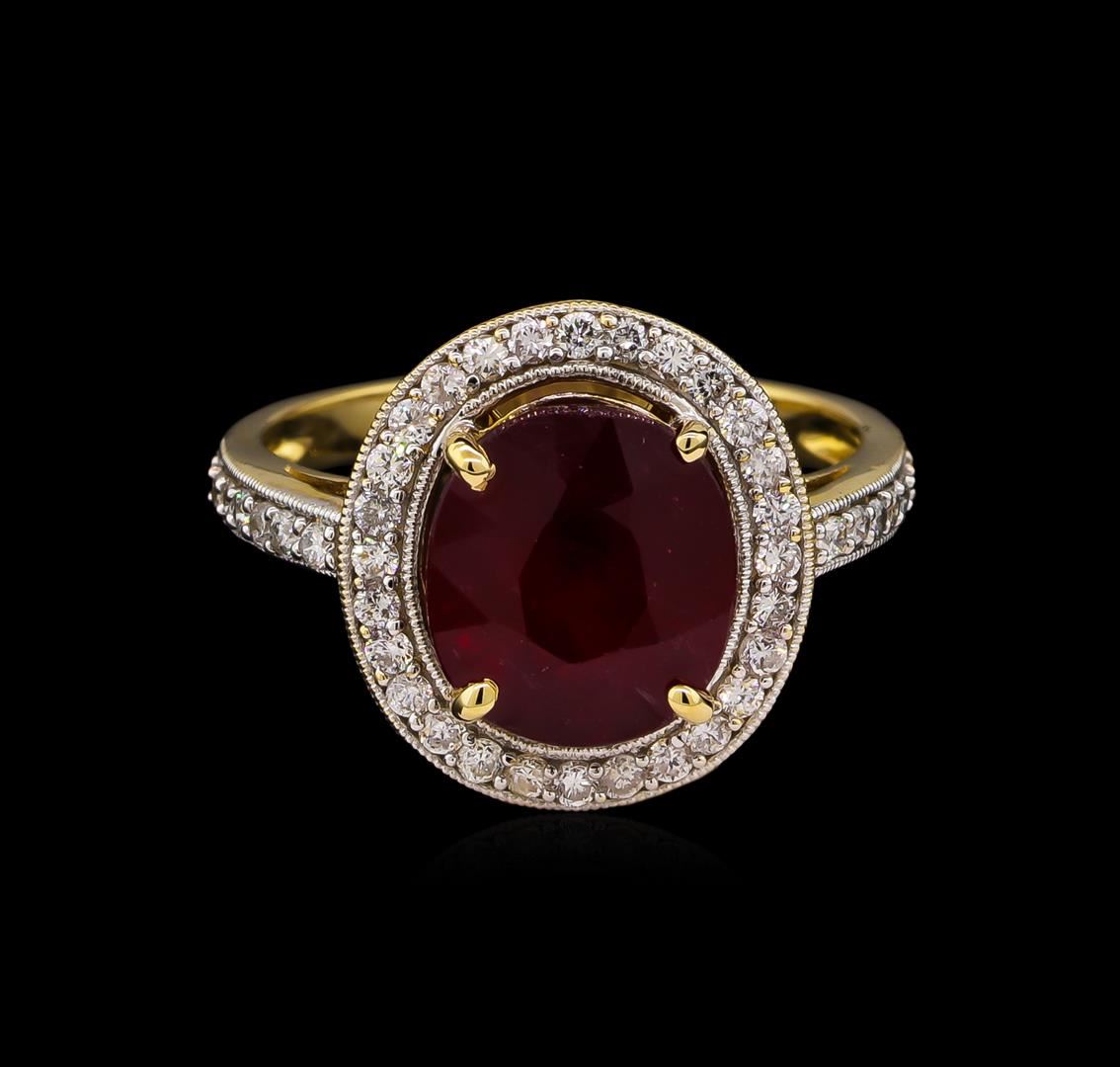 One electronically tested 14KT yellow gold ladies cast ruby and diamond ring. Condition is new, good workmanship. The featured ruby is set within a diamond bezel supported by diamond set shoulders, completed by a two millimeter wide band. Bright polish finish with rhodium accents and milgrain detailing. Trademark is Orianne. Identified with markings of "14K". Containing: One prong set oval mixed cut natural ruby, measuring 10.10 x 9.00 x 6.20mm, 10%. bulge factor, approximate weight of 4.98ct., clarity is heavily included, type II, medium dark, very slightly brownish, slightly purplish red color, (GIA slpR 6/3), cut is good. Transmitting light somewhat diffusely, transparent to translucent. Naturally occurring internal & external characteristics are present. Indications of laboratory high temperature heat treatment, with glass & flux additives. Graded in the setting. Ruby has a low tolerance to rhodium plating, repolishing the surface, & ultrasonic cleaning. Forty-Two prong set round brilliant cut diamonds, measuring 1.50 - 1.40 x 0.87mm (depth est.) approximate. Total Weight of 42 Stones = 0.56ct. Graded in the setting. Clarity: SI-1 to I-1 . Color: G - I. Total Weight of Colored Stones 4.98ct.. Total Weight of Diamonds 0.56ct.. Total Weight of Ring 4.92gm. AIG Appraised at $3,870.00.